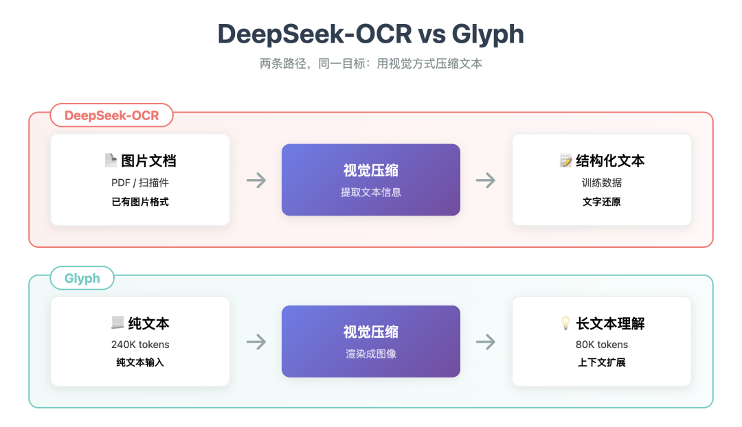 但底层逻辑一致: 用视觉方式表达文本,效率更高 两者都从「视觉压缩」出发 利用视觉 token 承载更多的文本信息