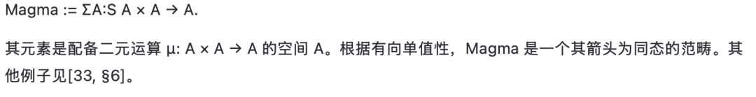 一个有用的单值性结果,如在§4.3中提到的,是结构恒等原理,它描述了从宇宙中构建的各种分类空间的路径空间。同样,有向单值性意味着一个有向类比,我们可能称之为结构同态原理,它将宇宙中构建的各种分类范畴中的箭头识别为适当结构的同态[68, 33]。例如,在带基点空间的范畴 s. 中,箭头可以被识别为带基点函数。例7.3 我们可以通过以下方式定义 S 中的magma的单纯形空间: