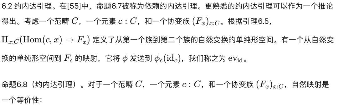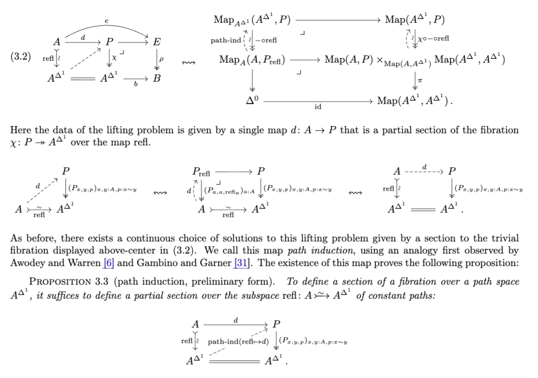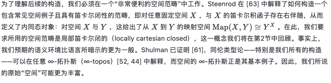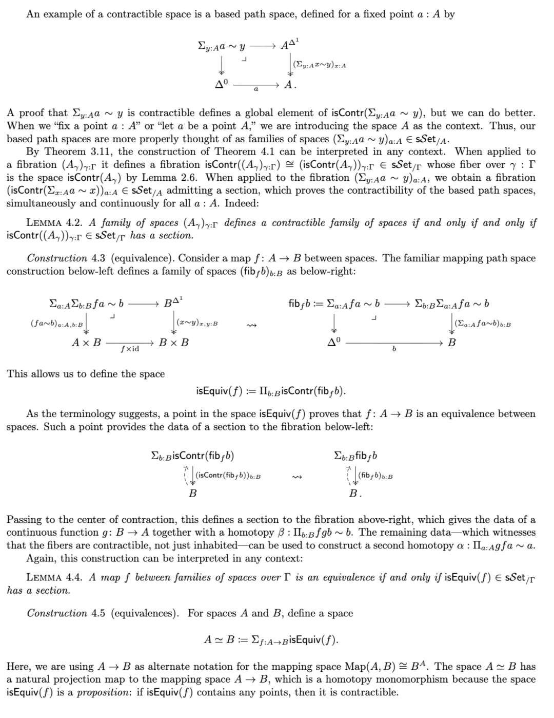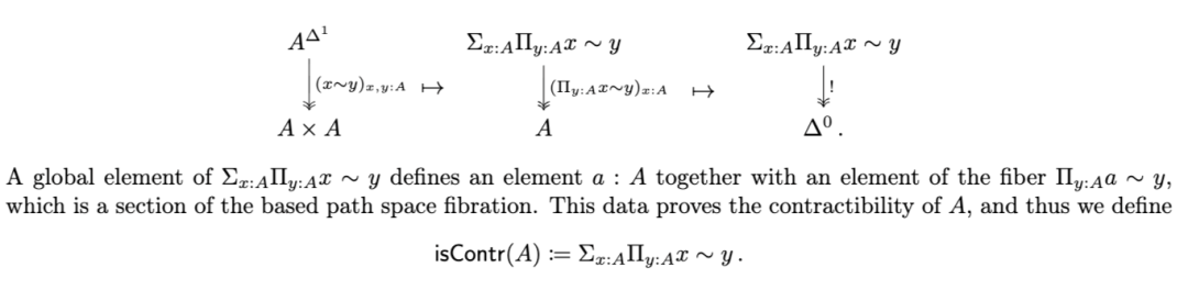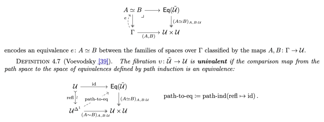 在 §4.1 中,我们构造了其点编码数学命题证明的空间,细节可参见 [59, §4]。在 §4.2 中,我们引入 Voevodsky 的泛等公理,并概述 Shulman [61] 提出的构造泛等全类的现代方法。在 §4.3 中,我们介绍几个标准应用,这些应用在教科书 [66, 58, 9] 中有更详细的描述。