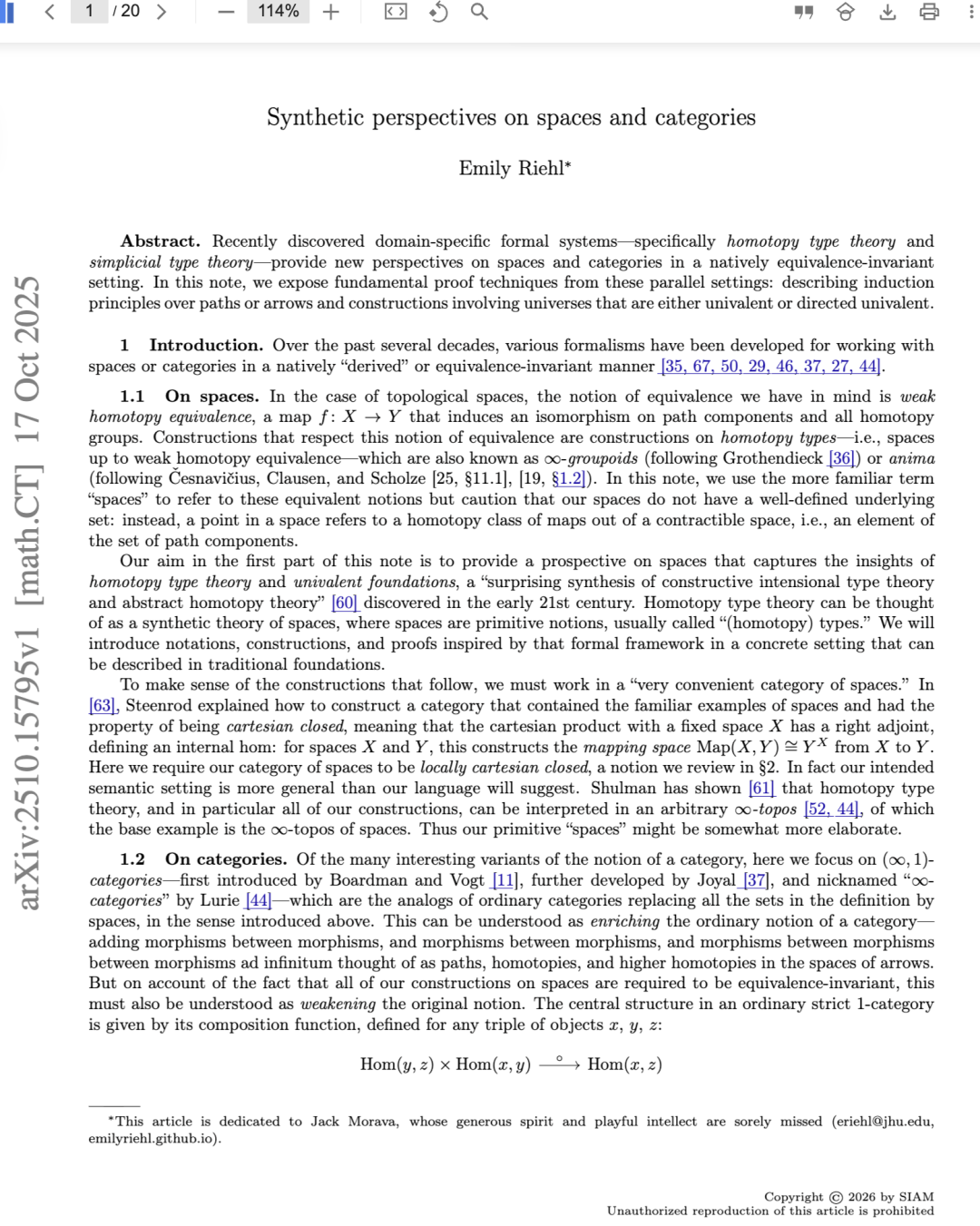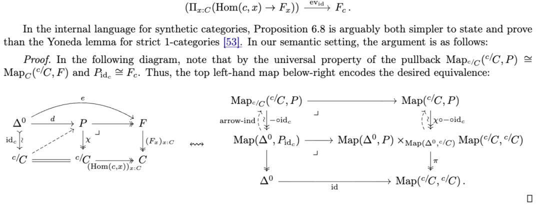 综合数学框架还有一个未在此处体现但激励本工作的额外优势:它们易于计算机形式化,因为在综合领域中的形式证明往往与其纸笔对应物更为贴近。特别是,同伦类型论中的定理——例如 §4.3 中提到的泛等性应用——已被多次形式化;而 §5–6 中出现的关于综合范畴的结果已在实现单纯类型论的计算机证明助手 RZK 中被形式化 [41, 42, 1],这是首次且迄今为止唯一一次对高阶范畴论结果的形式化。该证明助手在论文 [55] 撰写时尚未存在,因此形式化工作是在事后进行的,旨在修正原始论文中 §6 所指出的错误。