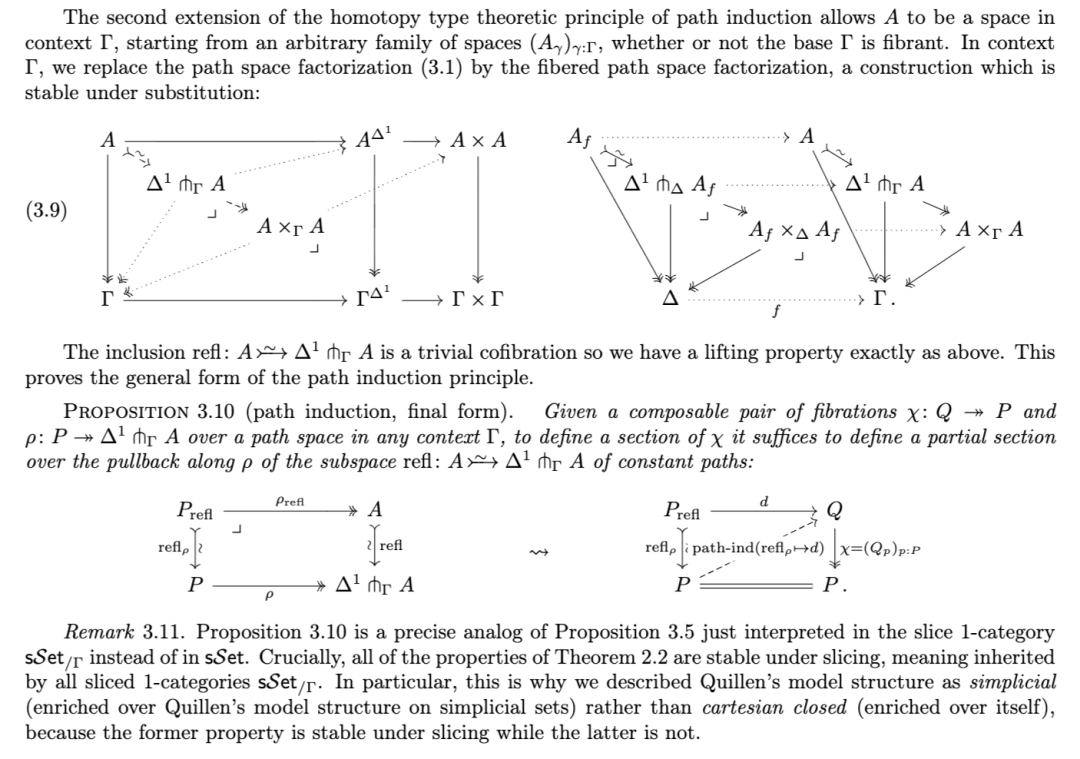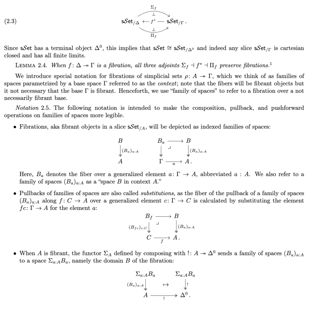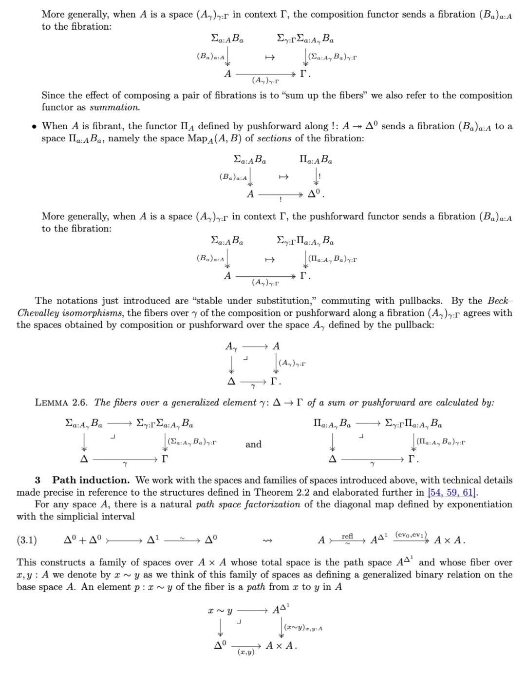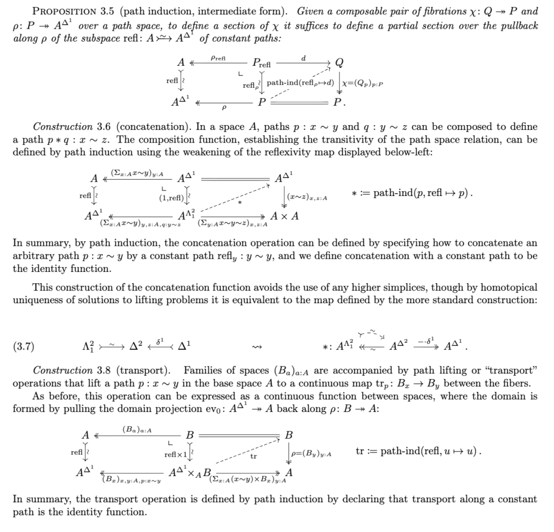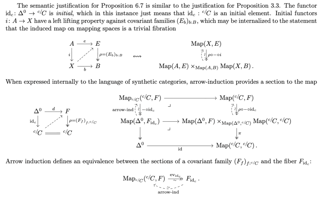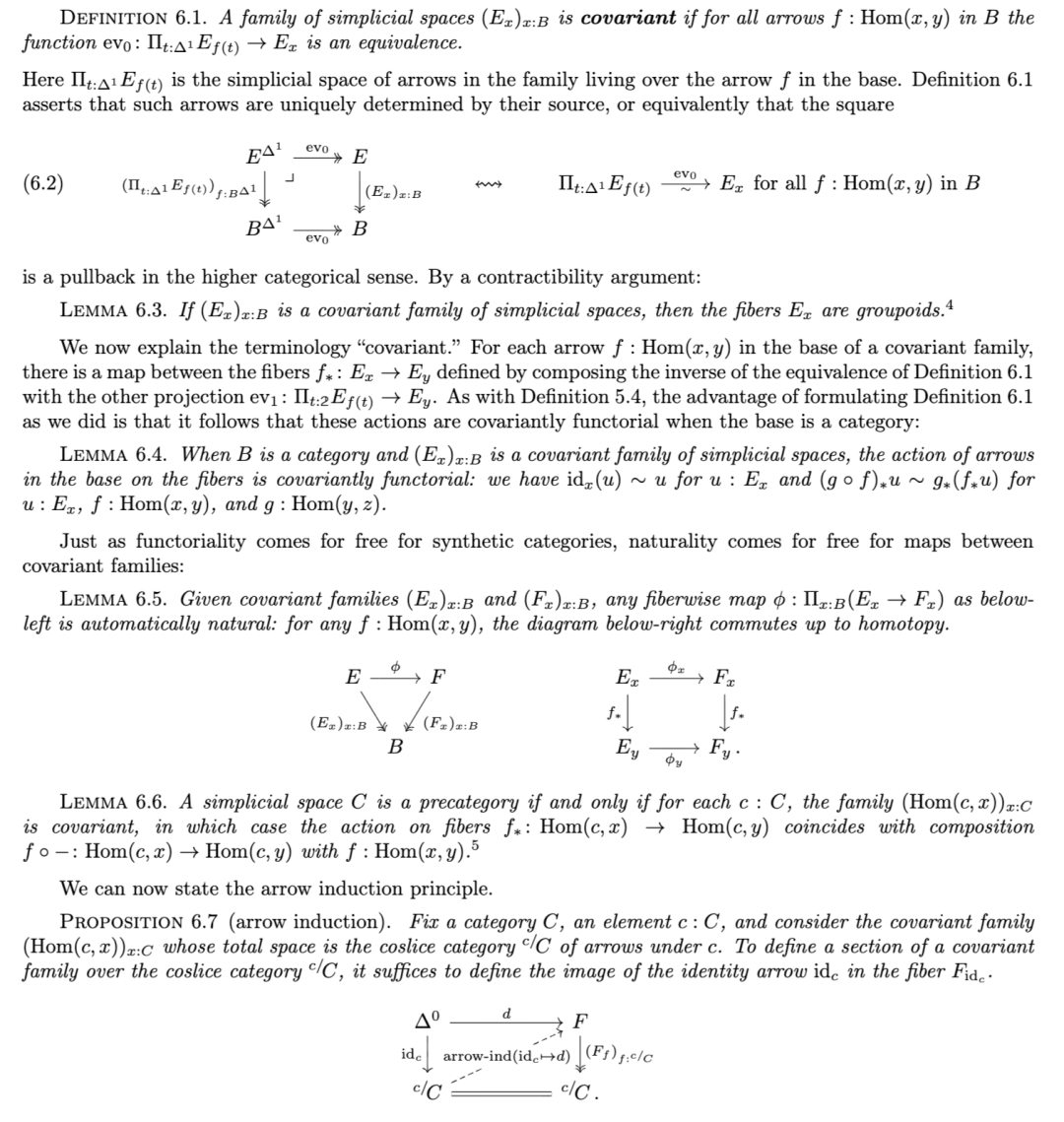 我们本可以轻易地用对综合空间与综合范畴的形式框架——即同伦类型论与单纯类型论——更精确的描述来填满本文。然而,我们的计划是突出一些基本构造,这些构造同样可以在传统基础中展开。在每个平行设定中,我们探索新的归纳原理:具体而言,在 §3 中探讨路径归纳法(path induction),在 §6 中探讨箭头归纳法(arrow induction);以及分别在 §4 和 §7 中使用的“泛等”(univalent)和“定向泛等”(directed univalent)全类。在 §8 中,我们将通过强调同事们关于综合空间、综合范畴及更广义的综合数学的持续工作来结束全文。