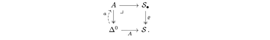 是基本例子)中工作;我们继续将泛型(纤维化)对象称为单纯空间。在该设定下,我们的协变族更常被称为左纤维化(left fibrations),即满足如下性质的映射ρ: E → B:在交换方块(6.2)中诱导出的到严格1-范畴拉回的映射是一个平凡纤维化。我们表明,结构恰当的左纤维化定义了一种纤维化结构的概念,该结构取值于小群胚且局部可表,因而存在一个单值的普适映射