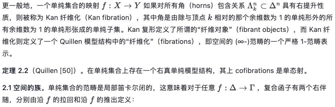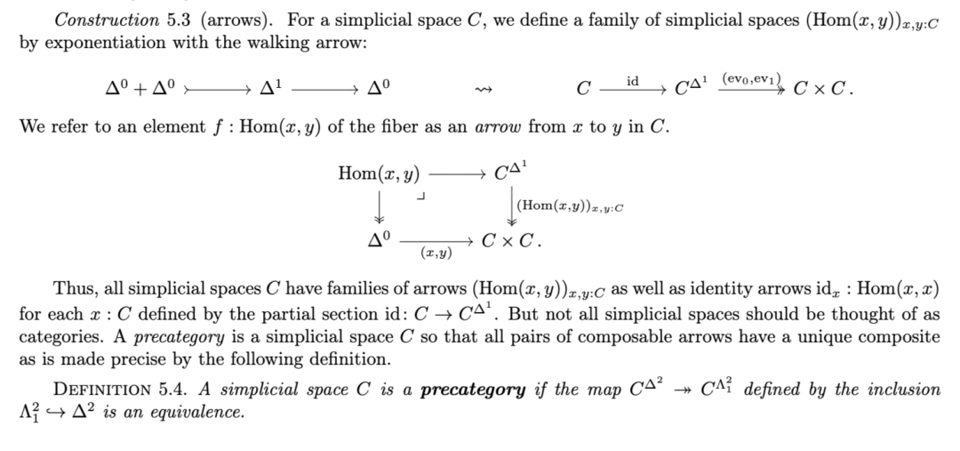 此处,它表现为箭头的等价不变空间之间的一个映射;因此,态射 g:Y→Z与 f:X→Y的复合仅在“可缩的选择空间”意义下良好定义,这是通常要求“复合唯一确定”这一条件的同伦类比。在本文中,我们使用术语“范畴”指代 ∞-范畴,并在少数出现的场合使用术语“(严格) 1-范畴”指代普通概念。
