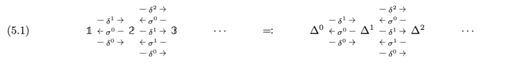 ——一个严格1-范畴,其对象我们称之为单纯形空间。这又是一个∞-拓扑,特别是一个局部笛卡尔闭范畴,对于所有§2-4中的构造都是适用的。在sSet^Δop中,行走箭头被解释为离散嵌入的代表Δ¹,以及图中(5.1)的其他对象。实际上,按照惯例,我们重用为刚刚构造的行走箭头——Δ⁰:=1, Δ¹:=2, Δ²:=3等——在(5.1)右侧所示的单纯形符号。更一般地,我们将使用单纯形符号,如Δᵢ² ⊂ Δ²,用于离散嵌入的单纯形空间,即在离散空间中取值的单纯形对象。
