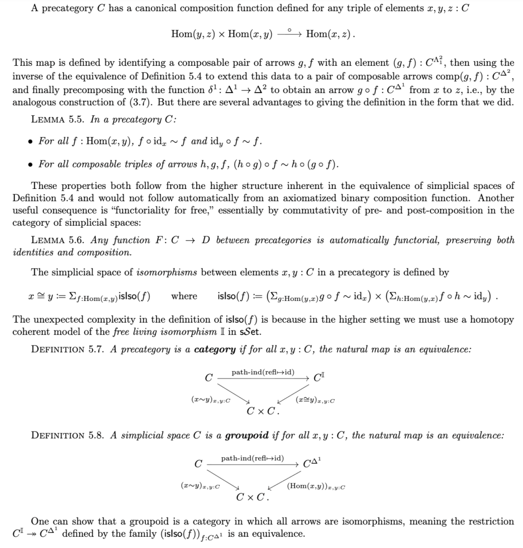 由于我们的“范畴”是由“空间”构建而成(如 §1.1 所述),在空间的综合框架内发展范畴理论颇具吸引力。这避免了传统“解析式”范畴定义所固有的著名复杂性 [4, 8]。对于同伦类型论的形式系统,我们添加了一条满足严格区间公理的公理化有向箭头。在 §5 中,我们简要概述了我们设定中用于综合范畴理论的结构,该结构在文献中被称为单纯类型论 [55]。再次强调,我们预期的语义环境比我们的语言所暗示的更为一般。我们所有的构造不仅对上述描述的 ∞-范畴有意义,而且对所谓的内 ∞-范畴(internal ∞-categories)——即在任意 ∞-拓扑斯中定义的 ∞-范畴 [47, 48]——或甚至更一般的设定 [51] 也有意义。