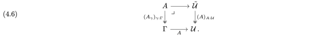 根据Voevodsky [39],宇宙是解决同伦类型理论中固有的一致性问题的基本成分(特别是,在1-范畴中,替换操作是定义到等价的),其中像拉回(4.6)这样的构造仅定义到同构,或者更糟,在(∞-)范畴中,像(4.6)这样的构造仅定义到等价。因此,我们构建宇宙作为(∞-)空间的严格1-范畴呈现,如定理2.2所示,并要求分类器拉回到1-范畴而不是(∞-)范畴。