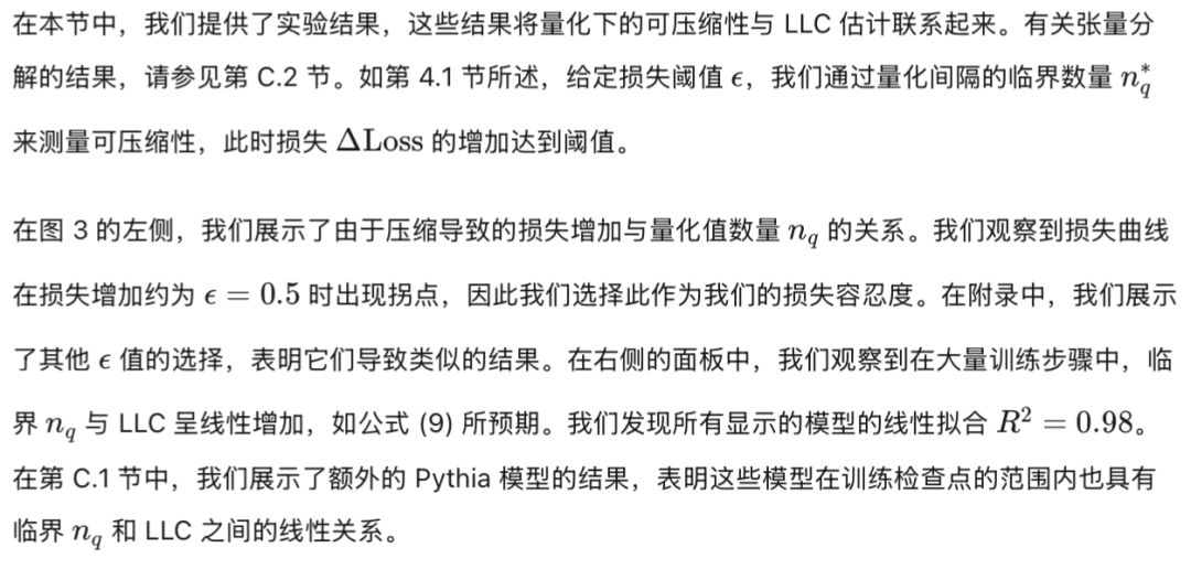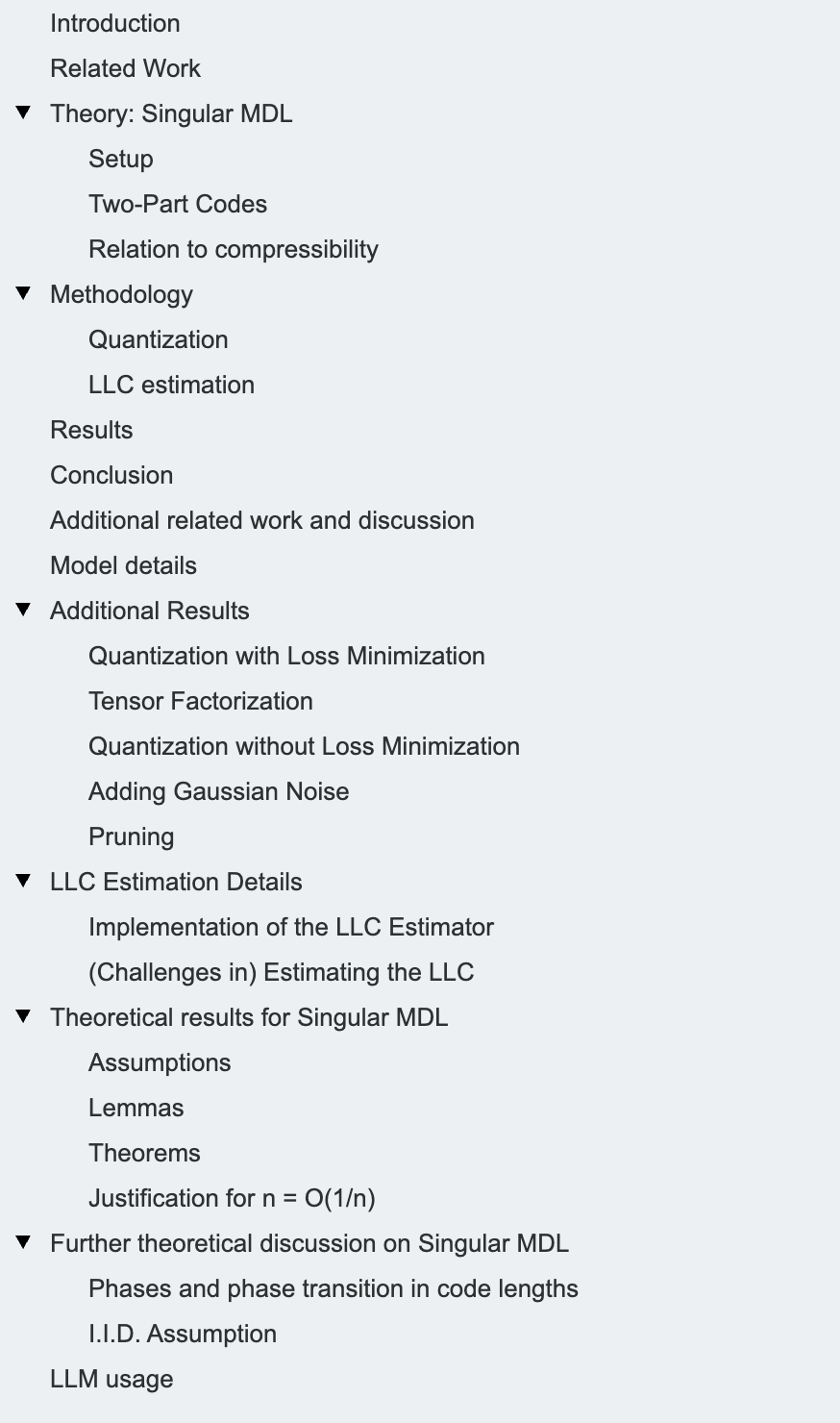 为了补充关于奇异 MDL 原则的理论,我们研究了可压缩性如何在实践中与局部学习系数(LLC)估计相关。在正文中,我们专注于量化(第 4.1 节)。在附录中,我们还处理了张量分解(第 C.2 节)、剪枝(第 C.5 节)以及向模型参数添加高斯噪声(第 C.4 节)。为了估计 LLC,在第 4.2 节中,我们描述了 Lau 等人(2024 年)估计器的一个预处理变体。