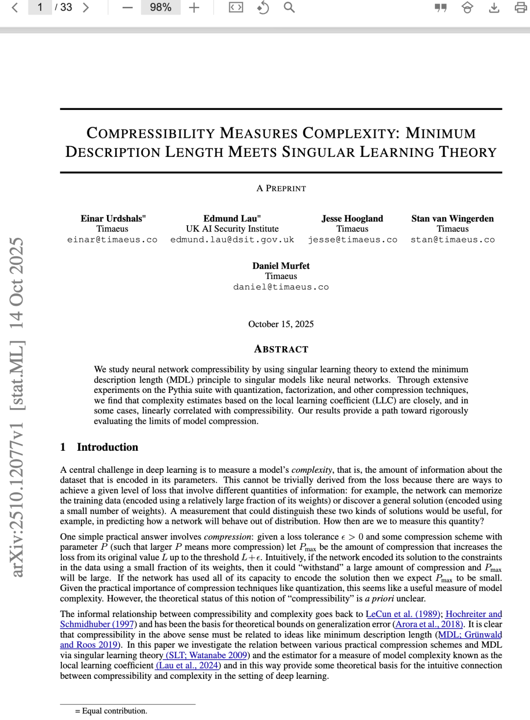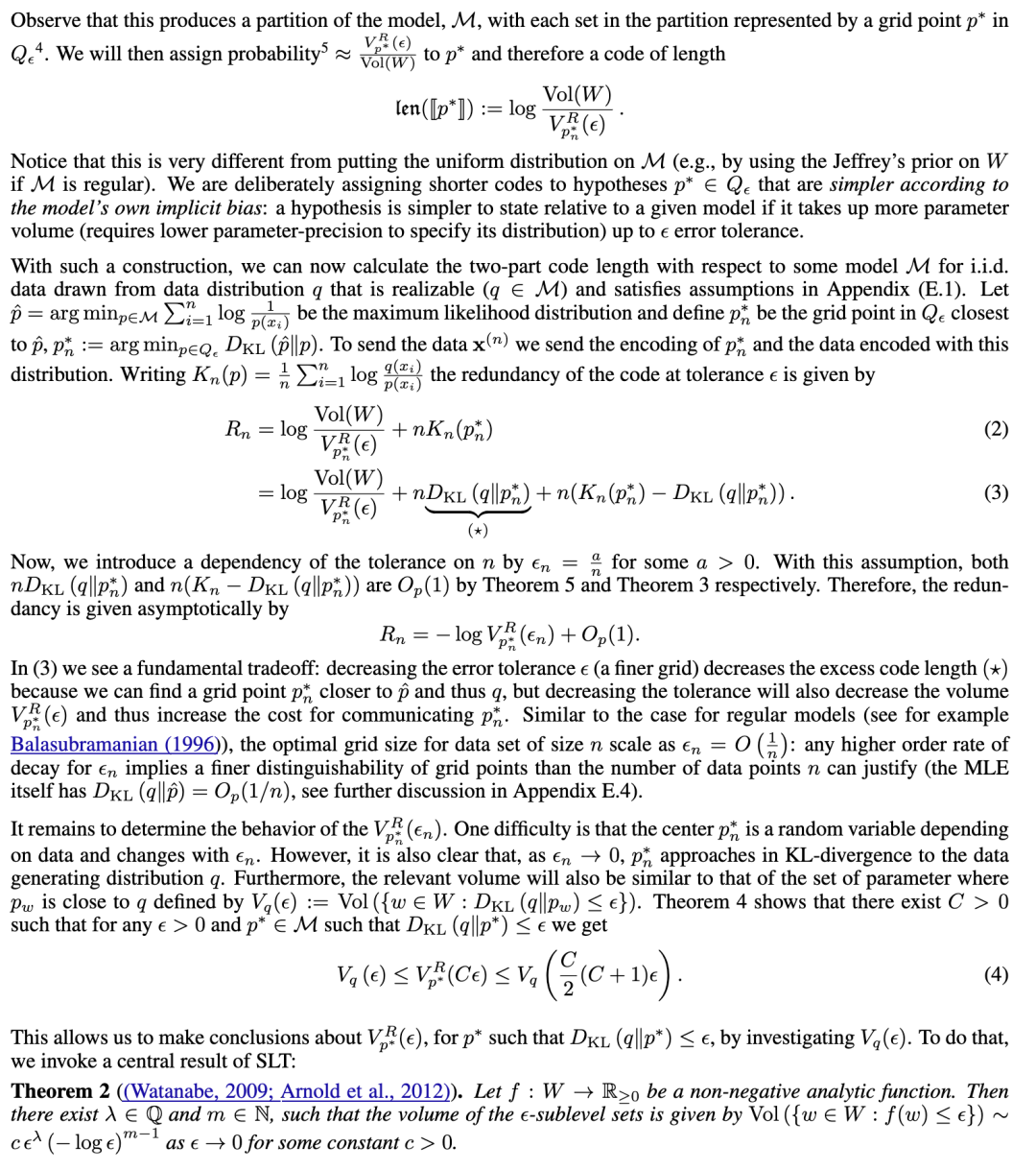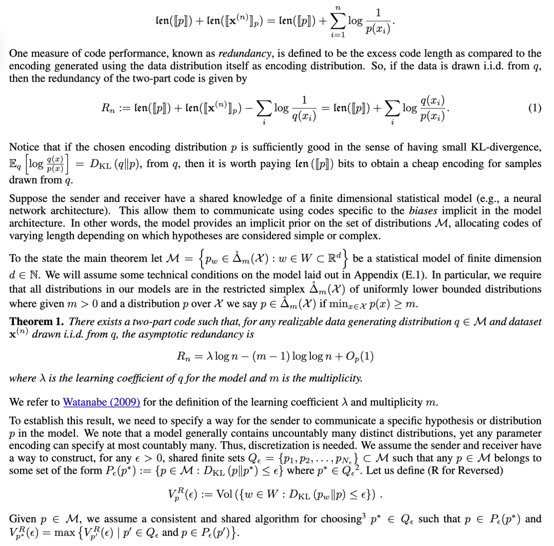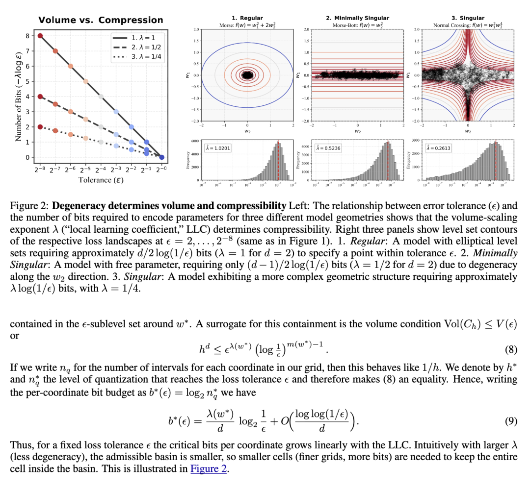 深度学习的一个核心挑战是衡量模型的复杂性,即模型参数中编码的关于数据集的信息量。这不能简单地从损失函数中得出,因为实现给定水平的损失有不同的信息量:例如,网络可以记忆训练数据(使用相对较大的权重部分进行编码),或者发现一个通用解(使用较少的权重进行编码)。一种能够区分这两种解决方案的度量将非常有用,例如,在预测网络在分布外的行为方面。那么,我们该如何衡量这种数量呢? 一个简单的实用答案涉及压缩:给定一个损失容忍度 ε > 0 和某种压缩方案,其参数为 P(P 越大表示压缩程度越高),设 Pmax 是使损失从原始值 L 增加到阈值 L+ε 的压缩程度。直观上,如果网络使用其权重的一小部分来编码数据约束的解决方案,那么它可以“承受”大量的压缩,Pmax 将会很大。如果网络使用了其全部容量来编码解决方案,那么我们预计 Pmax 将会很小。 鉴于量化等压缩技术的实际重要性,这似乎是一个衡量模型复杂性的有用指标。然而,这种“可压缩性”概念的理论地位在先验上是不明确的。 可压缩性与复杂性之间的非正式关系可以追溯到 LeCun 等人(1989 年);Hochreiter 和 Schmidhuber(1997 年),并且一直是泛化误差理论界限的基础(Arora 等人,2018 年)。很明显,上述意义上的可压缩性必须与最小描述长度(MDL;Gr ̈unwald 和 Roos 2019 年)等概念有关。在本文中,我们通过奇异学习理论(SLT;Watanabe 2009 年)和局部学习系数(Lau 等人,2024 年)这一衡量模型复杂性的估计量,来研究各种实际压缩方案与 MDL 之间的关系,从而为深度学习中可压缩性与复杂性之间的直观联系提供了一些理论依据。