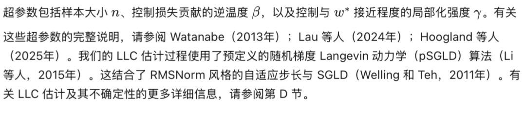 是一个独立的检验,表明我们当前基于 SGLD 的估计能够为多达 69 亿参数的变换器模型捕获有关模型复杂性的有意义信息。这对于将 SLT 应用于大型神经网络来说是一个令人鼓舞的信号,但 LLC 估计和类似技术仍然面临重大的方法论挑战。LLC 估计对超参数的敏感性以及估计值与真实值之间可能存在的差距代表了我们当前框架的主要局限性。