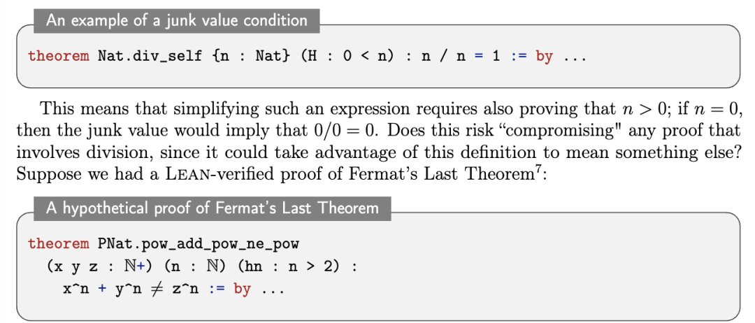 在LEAN中,当输出在其他情况下是未定义的时候,采用所谓的“无用值”是一种常见的惯例。例如,一个无限积分“计算”为零,一个不可微函数的导数,或一个无界序列的上极限也是如此。除以零也总是产生零。这可能看起来令人担忧,因为这可能导致定理的含义与其表面意思不符;但这种威胁并不像看起来那么大,因为它只影响定理陈述中使用的定义。例如,核心LEAN中表达自然数 n 满足