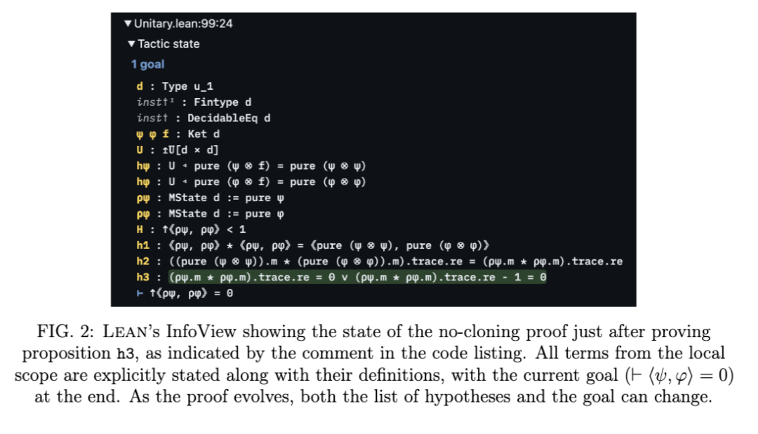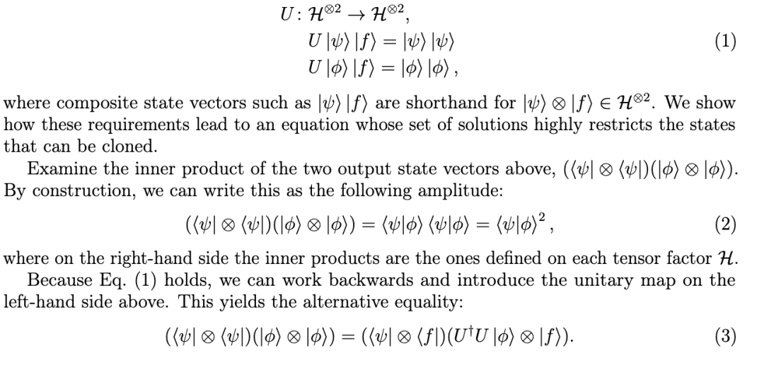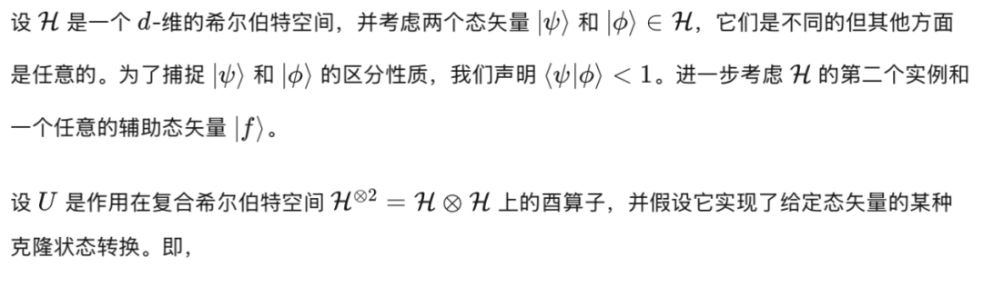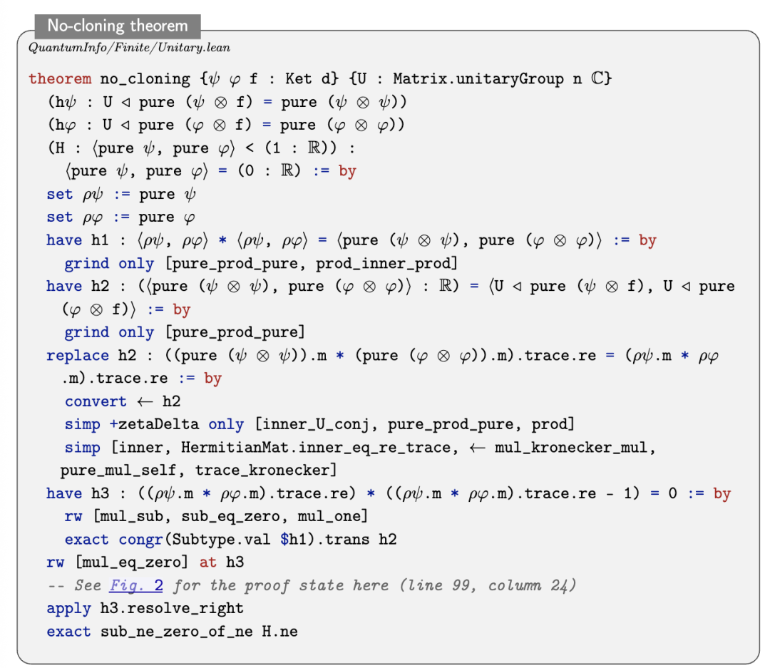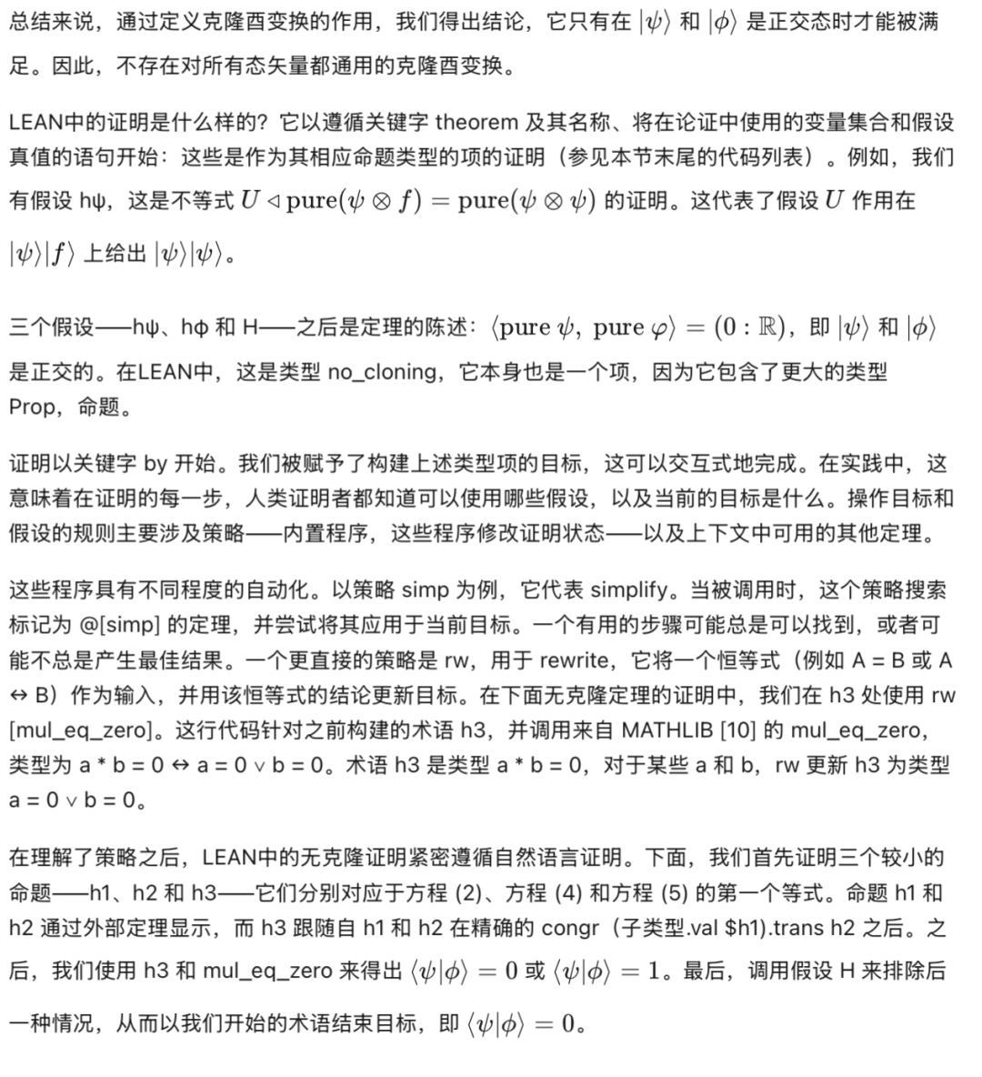通过一个简单但足够非平凡的证明步骤来说明是很有启发性的。这样一个陈述,对量子信息科学有广泛而重要的影响,是无克隆定理[16]。在其最简单的形式中,无克隆定理的证明是直接的,并且源于量子理论的基本事实。为了说明LEAN中形式化的工作流程,我们首先用自然语言重现教科书中的证明,然后将其与LEAN中的相应推导进行比较。在附录A中,我们提供了更多在LEAN-QuantumInfo库中证明的与量子信息理论相关的定理示例。