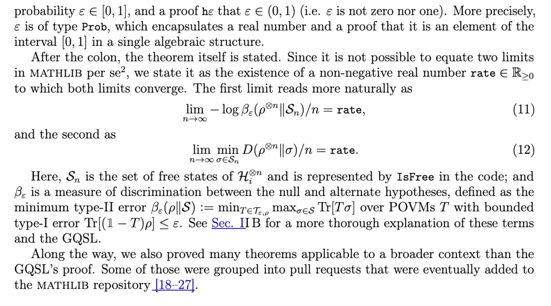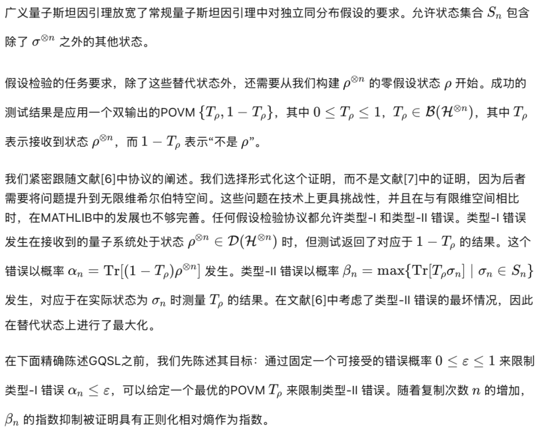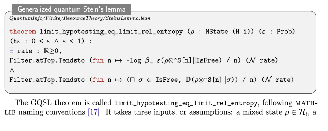 除了广义量子斯坦因引理(GQSL)对假设检验和资源理论的重要性外,它还承载着一个有趣的故事:2023年,文献[5]发现文献[3]的原始证明中存在一个漏洞,这随后激发了证明GQSL的努力,最终在文献[6, 7]中完成。这些事件激励我们使用LEAN将引理作为基于证明的量子信息研究的典范目标。