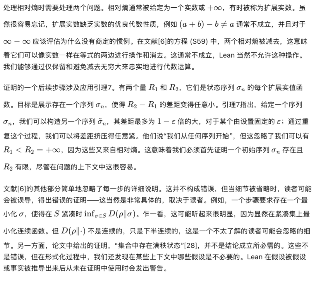 从所示结果出发的下一步包括去除引理对其他经典定理(如数据处理不等式)的依赖,这些定理已被陈述为公理。证明这些陈述将大大提高用Lean编写的量子信息库的可靠性。