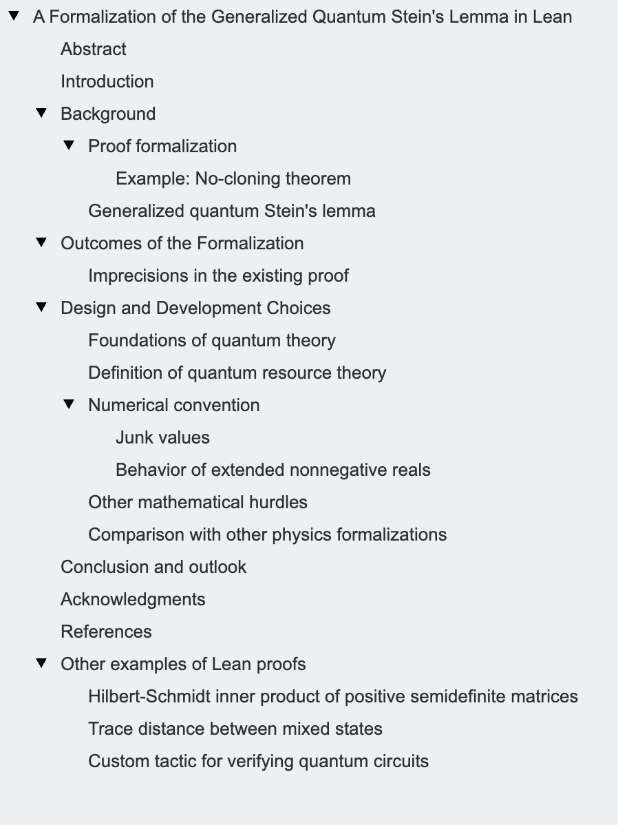 我们在LEAN定理证明器[8-10]中形式化了基于文献[6]的这个广义量子斯坦因引理(GQSL)。为了实现这一目标,必须构建量子信息的底层正式结构,这反过来又需要更基本和基础的数学结构。这一系列依赖关系展示了在LEAN(或其他定理证明语言)中进行证明工作的独特环境。