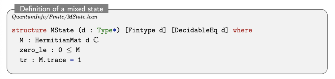 我们相信在LEAN中广泛形式化量子信息的长期目标,就像数学的其他分支在MATHLIB中被形式化一样。同样,我们相信量子信息理论的基于证明的性质使其特别适合于形式化,与其他物理学的子领域相比。