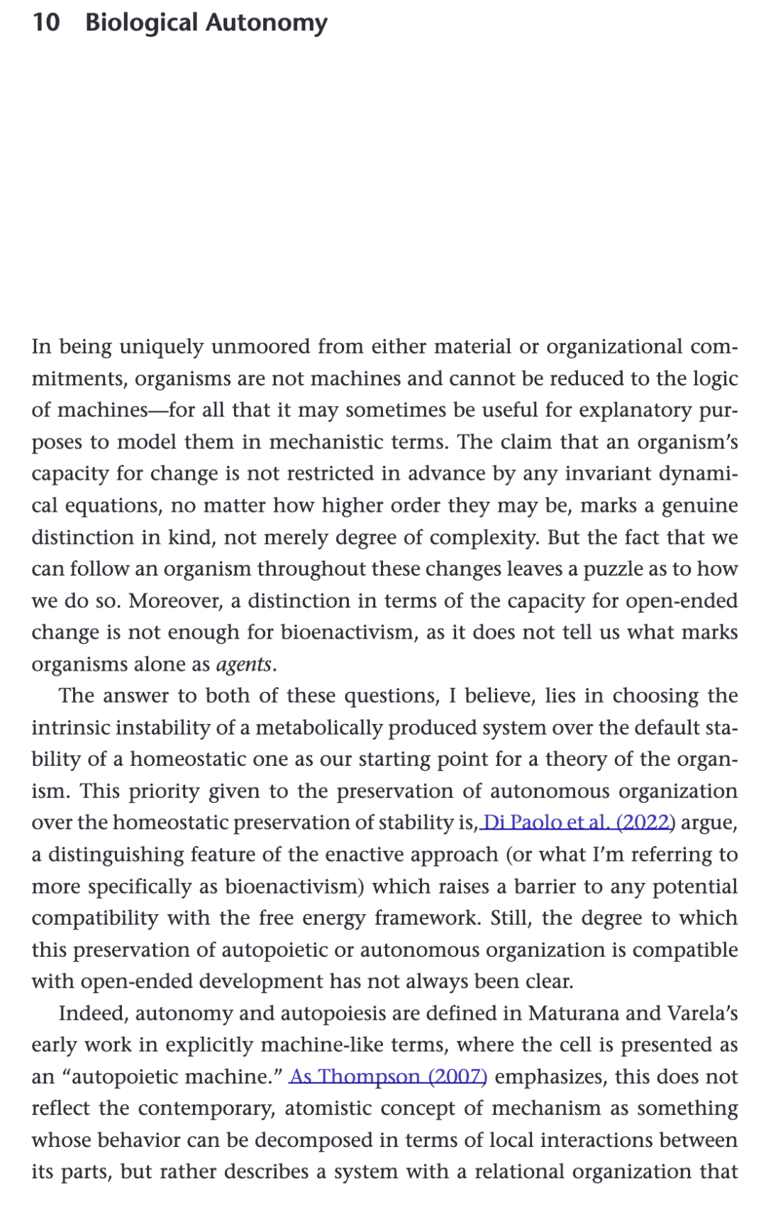 因此,当代生物能动论对自主性的定义相较于 Bourgine 与 Varela(1992)的“操作闭合”(operational closure)的一个改进之处在于:它描述了一种以变化与过程为首要(under which change and process are primary)。然而,正如 Bickhard(2008)所指出的,在这些当代自主性表述中,生命的物质与能量条件(material and energetic conditions)仍未得到充分发展。这导致了琐碎化(trivialization)的风险。正如 Thompson 与 Di Paolo(2014)所承认的: