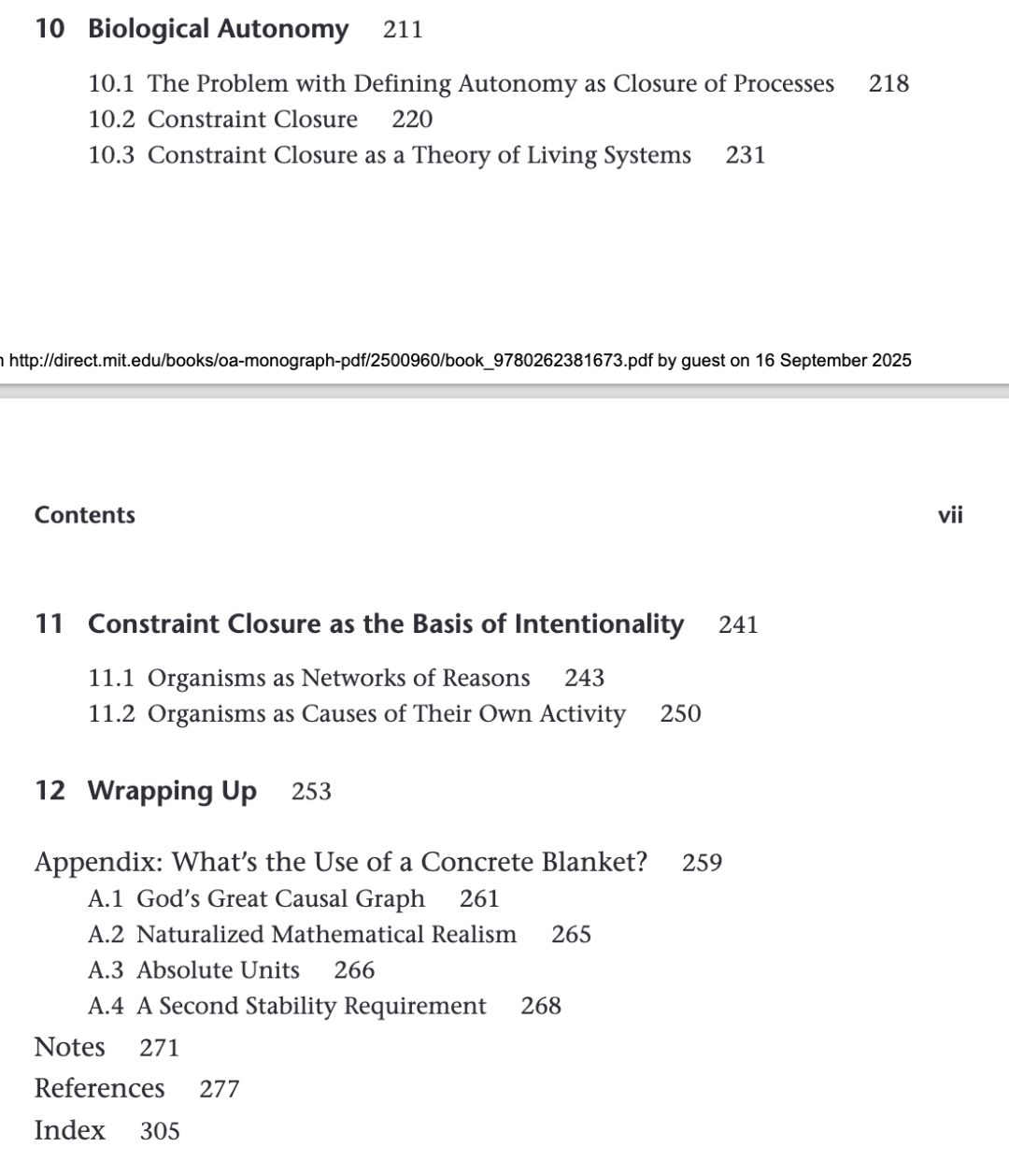 我主要在简单有机体的层面上探讨了这种以约束闭合(constraint closure)来理解自主性(autonomy)与自创生(autopoiesis)的观点。然而,“脆弱约束”这一概念之美在于:它在热力学上足够严格,足以避免将规范性与意向性归因于任何稳定的机械装置;同时又足够普遍,原则上可在生物组织的所有不同尺度上被实例化。