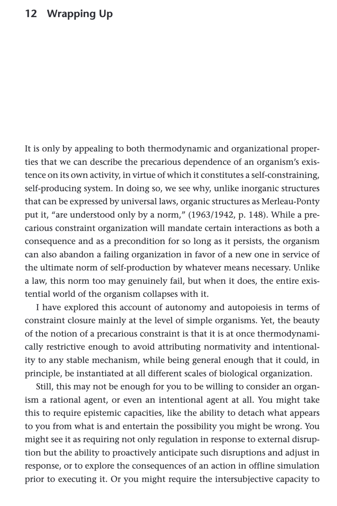 然而,由于近期能动论工作聚焦于这些自主性的次级维度(secondary dimensions),旨在向上扩展以解释认知层面的学习与发展过程,我认为,关于有机身体的先在自主性(prior autonomy of the organic body)——即自创生最初试图在分子层面捕捉的构成性——的描述仍不够精细。