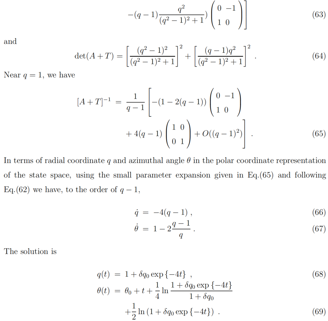 在这里,光滑函数 R 和 Φ 具有以下性质:在径向坐标中,R(q=1)=0 是一个固定点,且 Φ(q=1)= 常数。我们指出,从数学上讲,二维中的任何形状的极限环都可以变形为一个环,并且在该极限环附近,动力学方程可以通过非线性坐标变换映射到上述形式。因此,方程(70)和(71)可以被视为二维中一个典型极限环的表示。