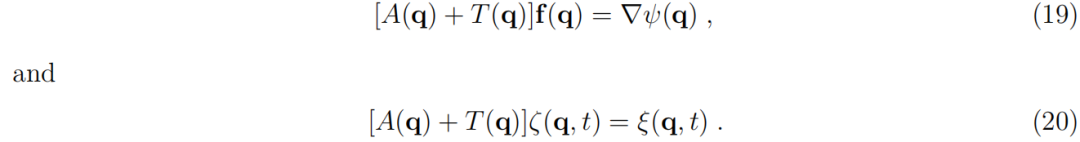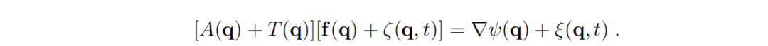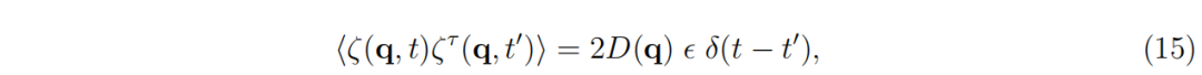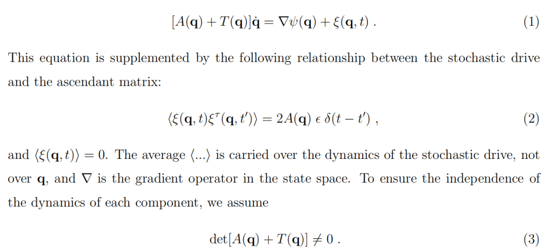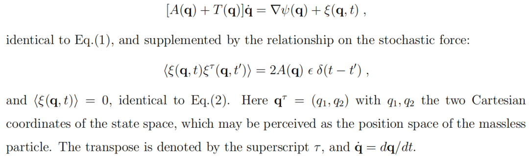 这里,δ(t) 是狄拉克δ函数。在方程(2)中,我们假设随机驱动力是一个零均值的高斯白噪声。因子2是当前表述中的一个常规选择,而 ϵ 是一个正的数值常数,对于许多情况,可以将其设为1(ϵ=1),而不影响生物学描述。方程(2)所表达的随机驱动力与上升矩阵之间的关系保证了上升矩阵 A(q) 是正半定且对称的。