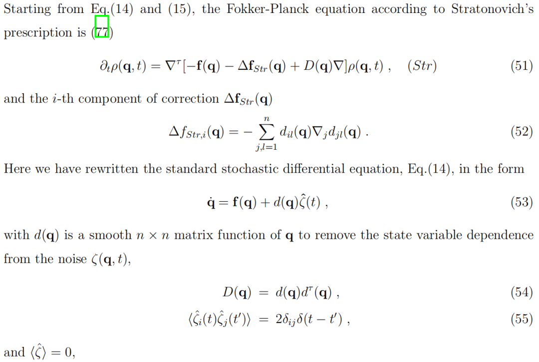我们可以进一步阐释第三定律。在得到方程(39)时,我们采用了一种特定的方式来对随机驱动力和确定性驱动力进行分类,即零“质量”极限 m→0。我们在第三节C小节中提到,还有其他方法可以进行这种分类。其中两种在物理和生物科学中特别著名,分别是伊藤(Ito)和斯特拉托诺维奇(Stratonovich)方法。从方程(14)和(15)出发,根据伊藤规则,福克-普朗克方程为(77)