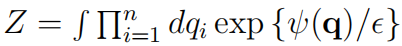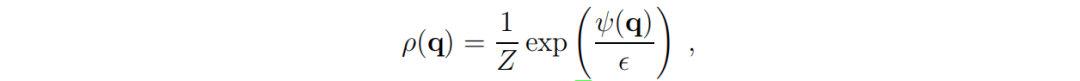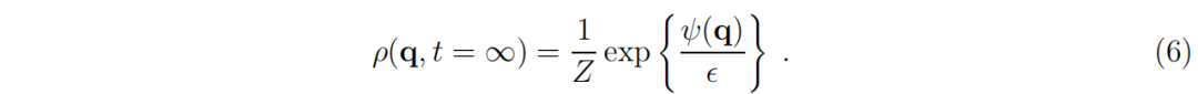 ,是物理学中的配分函数,它是对整个状态空间的求和,并作为归一化因子。方程(6)将在下一部分作为方程(38)推导出来。或者,也可以通过将其代入方程(39)直接验证。对于熟悉物理学中的朗之万方程(30;77)的读者来说,以 −ψ 作为能量,ϵ 作为温度,方程(6)可能看起来直观上显而易见。对于不熟悉相应物理学的读者,需要暂时信任方程(6),直到方程(38)和(39)或(42)。