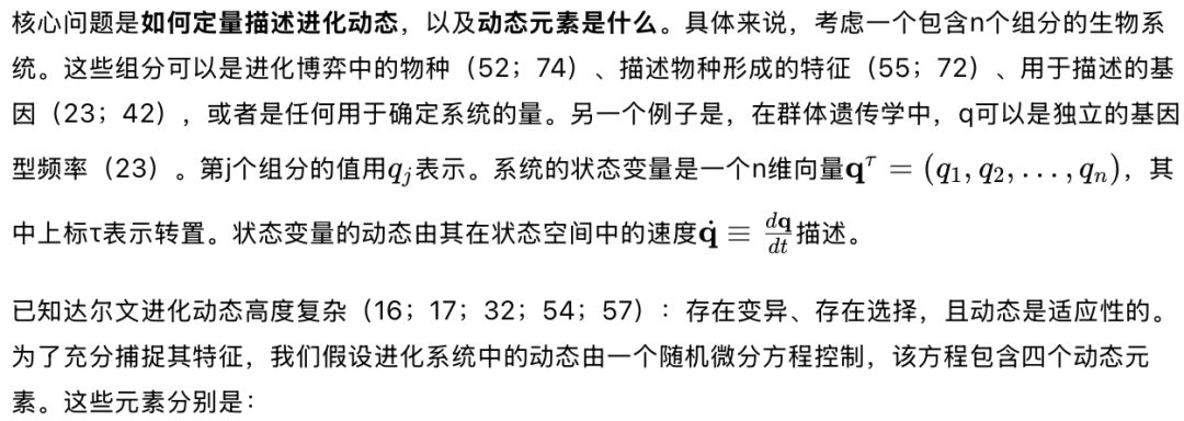 除了对文献的简要回顾,本文的重点是进化动态的结构,即应该有多少个独立的动态组分,它们的性质是什么,以及控制动态方程应该采取何种形式。我们不会讨论每个动态组分的具体结构。以经典物理学为例,我们试图回顾和建立的内容类似于牛顿的运动定律,而不是关于质量和力的结构,例如他的万有引力定律。因此,本文的内容在很大程度上类似于达尔文和华莱士发表自然选择进化理论时的内容(17):存在进化动态的定律,但动态组分的底层结构,例如与遗传学相关的结构,将不会被讨论,而是被假定为存在。这意味着许多定量且重要的问题,例如进化的速度(62),无法在本文中讨论,因为讨论这些问题需要对动态组分结构的了解。