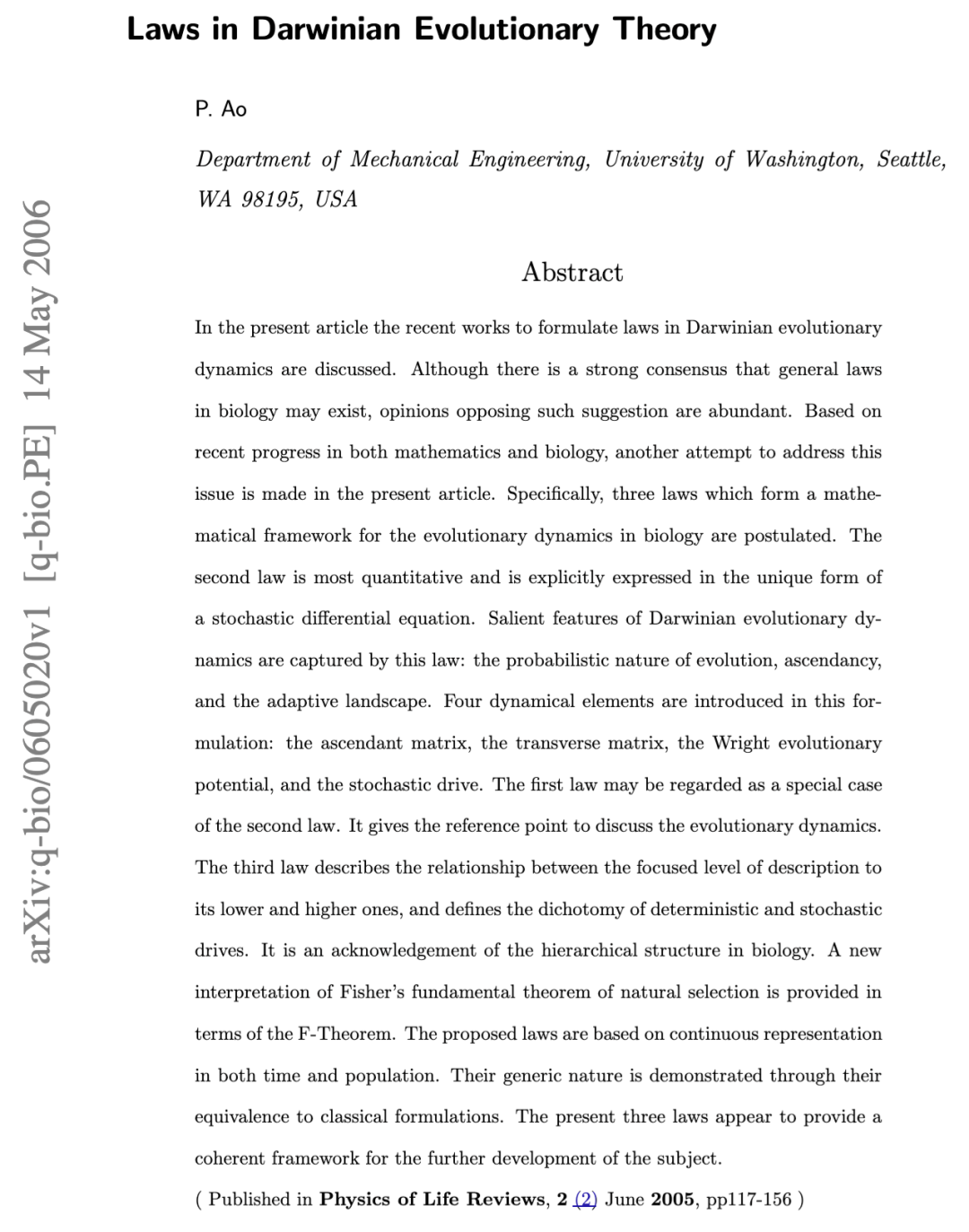 摘要 本文讨论了近期关于制定达尔文进化动态定律的工作。尽管存在广泛共识认为生物学中可能存在一般性定律,但反对这种观点的意见也相当多。基于数学和生物学的最新进展,本文再次尝试探讨这一问题。具体而言,本文提出了三条定律,形成了生物学进化动态的数学框架。第二定律最具定量性,并以随机微分方程的独特形式明确表达。该定律捕捉了达尔文进化动态的显著特征:进化的概率本质、上升性以及适应性景观。该公式引入了四个动态元素:上升矩阵、横向矩阵、赖特进化势和随机驱动力。第一定律可以被视为第二定律的一个特例,它为讨论进化动态提供了参考点。第三定律描述了所关注的描述层次与其上下层次之间的关系,并定义了确定性驱动力和随机驱动力的二分法。它承认了生物学中的层次结构。本文还以F-定理的形式对费舍尔自然选择的基本定律提供了新的解释。所提出的定律基于时间和种群的连续性表示。它们的通用性通过与经典公式的一致性得到证明。这三条定律似乎为该学科的进一步发展提供了一个连贯的框架。 (发表于《生命物理评论》,2005年6月,第2卷第2期,第117-156页)