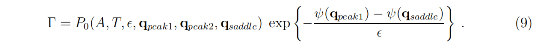 人们可能会好奇,系统是如何从一个势能峰值移动到另一个势能峰值的?这一过程最初由赖特(83)进行了可视化。相关的数学计算似乎最早是由克拉默斯(43)完成的。它已经被应用于生物学(9),并表明随机驱动力必须参与其中。从一个势能峰值跳到另一个势能峰值必须借助随机驱动力。跳跃率 Γ 中的主导因素通常是起始峰值(峰值1)与跨越山谷到达另一个峰值的最高点(鞍点 qsaddle)之间的势能差(9;43;77):