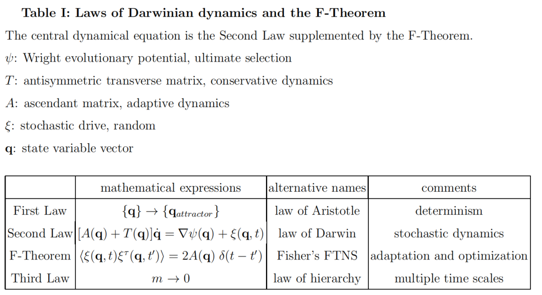 我们提出了三条定律来数学化地描述进化动力学:亚里士多德定律、达尔文定律和层次定律。第一定律,即亚里士多德定律,强调进化动力学的确定性方面。这条定律定义了讨论的参考点。最基本的方程,即第二定律或达尔文定律,以一种独特的随机微分方程形式表达。当前表述引入了四个动力学元素:上升矩阵、横向矩阵、赖特进化势和随机驱动力。最终和终极的选择由赖特进化势代表,它决定了稳态分布。在任何给定时间,瞬时选择由第二定律中编码的全部四个动力学元素决定,而这些元素并不一定会增加赖特进化势。适应性和优化的倾向都被编码在F-定理中。生物学描述的层次性被编码在第三定律中,其精确的数学程序取决于所考虑的具体问题。这通过随机微分方程的几种积分形式的存在得到了说明。表I总结了当前的表述。