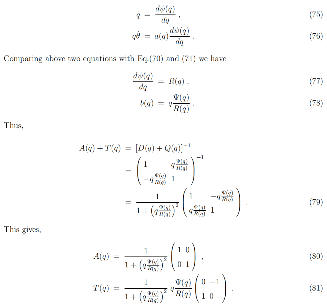 根据方程(70)和(71)中的旋转对称性,我们还选择仅依赖于径向坐标 q 的势函数,记为 ψ(q) 。在上述选择下,在极坐标系中方程(72)意味着