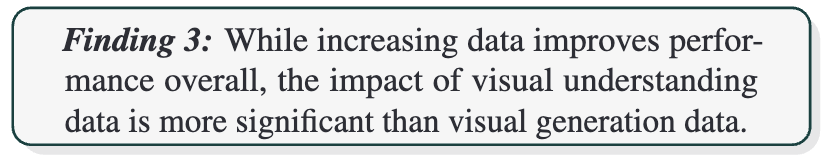 其次,我们进一步证实了视觉理解与视觉生成能力之间存在内在联系,且这种联系是不对称的。具体而言,增加理解数据不仅能提升视觉理解能力(以更高的 VQA 得分为衡量标准),也能改善生成质量(以更低的 FID 得分为衡量标准)。相反,增加生成数据虽能提升生成质量,也能在一定程度上增强视觉理解能力,但效果较弱。重要的是,我们的研究揭示了训练不同能力对模型整体视觉表现影响的不对称性:以理解为中心的训练在提升视觉理解与生成两方面,均显著优于以生成为中心的训练。