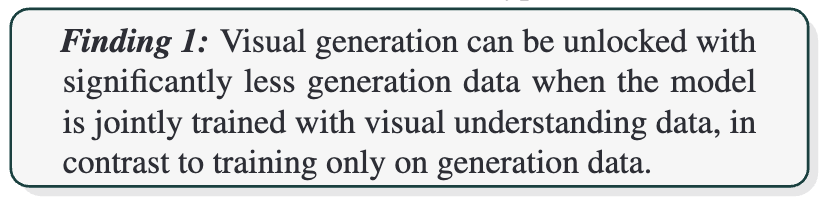 相比之下,与其他数据集联合训练可显著提升生成性能。模型仅需 5k 条生成数据即可生成有效的视觉标记,且性能在约 200k 样本时趋于稳定。这表明,视觉生成并非一种正交能力,而是一种在联合训练中更高效涌现的能力。