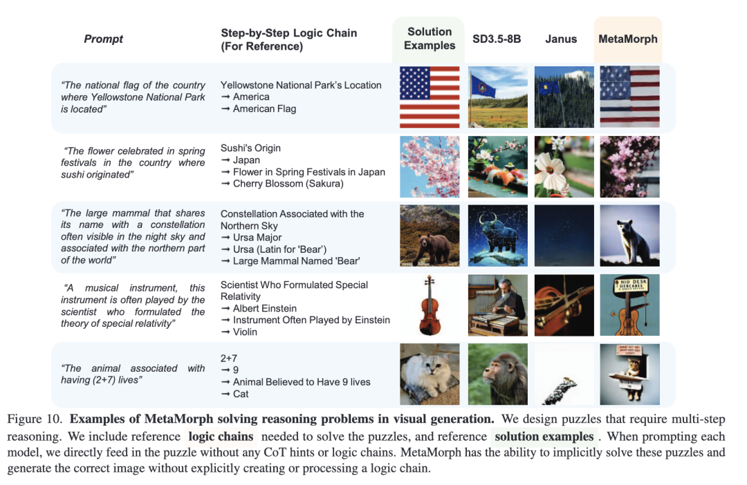 在图 10 中,我们展示了若干示例,其中模型根据谜题式提示生成图像,例如:“黄石国家公园所在国家的国旗”。对于每个谜题,我们直接使用提示“生成一张{谜题}的图像”,并未在提示中显式调用思维链(Chain-of-Thought, CoT)[70]。MetaMorph 能够从需要多步推理的提示中直接生成正确的图像。