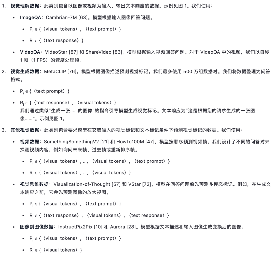 由于 VPiT 使模型能够在响应中同时预测文本和视觉标记,因此它允许使用更广泛的训练数据。另一方面,传统的视觉指令微调主要依赖问答对。我们的数据集大部分是公开可用的,我们将其分为以下三大类别。这种分类方式使我们能够系统地研究该模型,具体细节见第 3 节和第 4 节。所有数据类型均按指令微调风格的提示与响应对格式组织。更多细节请参见附录 C.2。