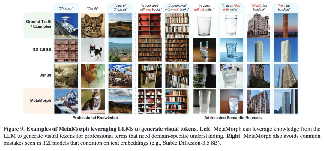 MetaMorph 能够有效利用预训练 LLM 中蕴含的世界知识。我们在图 9 左侧展示了若干示例:我们提示模型生成一些需要非平凡且专业化知识的概念,例如“乔戈里峰(Chhogori)”(世界第二高峰)、“南美小斑虎猫(Oncilla)”(一种南美洲的小型野猫)以及“奇扎里拉(Chizarira)”(津巴布韦的一处偏远荒野地区)。