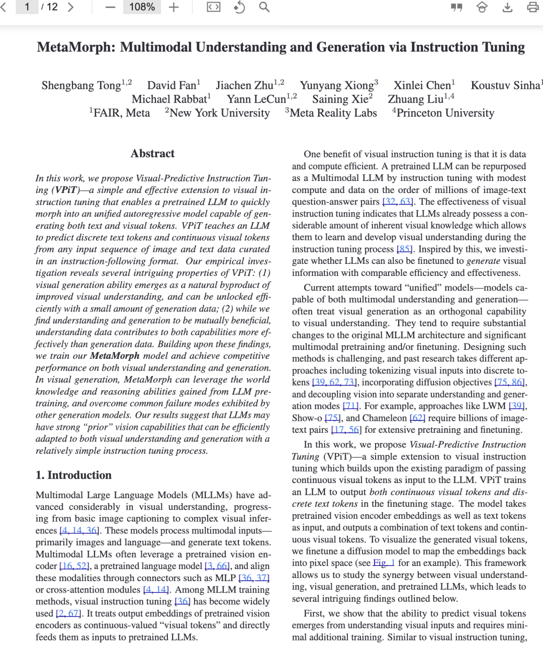 摘要 在本研究中,我们提出了视觉-预测性指令微调(Visual-Predictive Instruction Tuning,VPiT)——这是一种对视觉指令微调的简单而有效的扩展方法,能够使一个预训练的大语言模型(LLM)快速转变为统一的自回归模型,从而同时生成文本和视觉标记。VPiT 训练 LLM 从以指令遵循格式组织的图像与文本混合输入序列中,预测离散的文本标记和连续的视觉标记。我们的实证研究表明,VPiT 具有若干引人注目的特性:(1)视觉生成能力作为视觉理解能力提升的自然副产品而出现,并且仅需少量生成数据即可高效激活;(2)尽管我们发现理解与生成能力相互促进,但理解类数据对这两种能力的贡献比生成类数据更为有效。基于这些发现,我们训练了 MetaMorph 模型,在视觉理解和生成任务上均取得了具有竞争力的性能。在视觉生成方面,MetaMorph 能够利用 LLM 预训练所获得的世界知识和推理能力,克服其他生成模型常见的失效模式。我们的结果表明,LLM 可能具备强大的“先验”视觉能力,通过相对简单的指令微调过程,即可高效地适配到视觉理解与生成任务中。