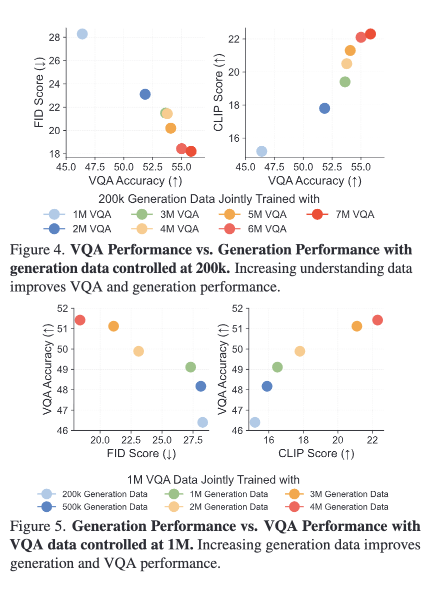 更多生成数据也能同时提升理解与生成能力。 接下来,我们探究反向关系:增强模型的视觉生成能力是否也与更高的 VQA 表现相关?为此,我们以固定的 100 万条 VQA 样本作为理解能力的基准,并在此基础上变化生成数据的规模({20 万、50 万、100 万、200 万、300 万、400 万}),在联合训练中调整模型的生成能力。结果如图 5 所示。在固定 100 万 VQA 数据的设定下,更强的生成能力与 VQA 性能的提升呈正相关。这表明,增加生成数据不仅能改善生成质量,还能对 VQA 表现产生积极影响。