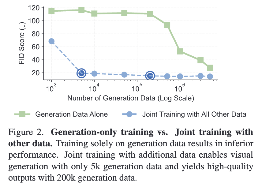如图 2 所示,仅使用视觉生成数据进行训练的效果显著弱于与其他所有数据联合训练的效果。即使使用超过 300 万对图像-文本样本,模型仍难以生成高质量的视觉图像(FID 分数约为 40),其性能仍不如使用 500 万对样本进行联合训练的结果。这表明,仅依赖视觉生成数据进行训练的样本效率显著较低。这一发现与先前的一项研究 [84] 一致,该研究也指出,当仅使用生成数据训练时,LLM 难以被有效微调以生成视觉标记。