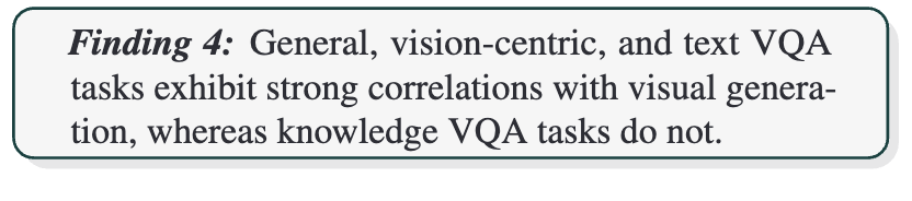 鉴于理解任务具有多样性,例如 OCR(光学字符识别)、以视觉为中心的任务(Vision-Centric tasks)以及基于知识的任务(Knowledge-based tasks),我们进一步探究哪些任务与生成能力的相关性最强。受 Cambrian-1 的启发,我们将 VQA 任务划分为五类:通用(General)、文本与图表(Text&Chart)、高分辨率(High-Resolution)、知识型(Knowledge)和视觉中心型(Vision-Centric)VQA。