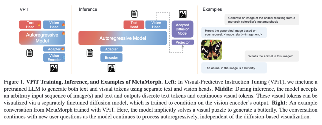 基于上述发现,我们利用 VPiT 训练了一个名为 MetaMorph 的统一模型,用于预测多模态标记。我们整合了多样化的数据源,涵盖常见的视觉问答数据集,以及无文本标注的纯图像和视频数据。MetaMorph 在视觉理解与视觉生成的基准测试中均取得了具有竞争力的性能。此外,我们表明这种统一建模方法能够充分利用 LLM 的强大能力。例如,MetaMorph 在生成视觉标记时可提取预训练 LLM 中的知识。更令人惊讶的是,我们观察到 MetaMorph 能在生成视觉标记前隐式地执行推理步骤——例如,当提示为“君主斑蝶毛虫蜕变后的动物”时,MetaMorph 成功生成了一只蝴蝶的图像(见图 1)。