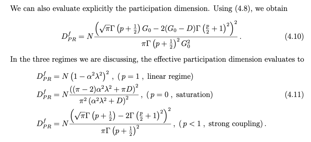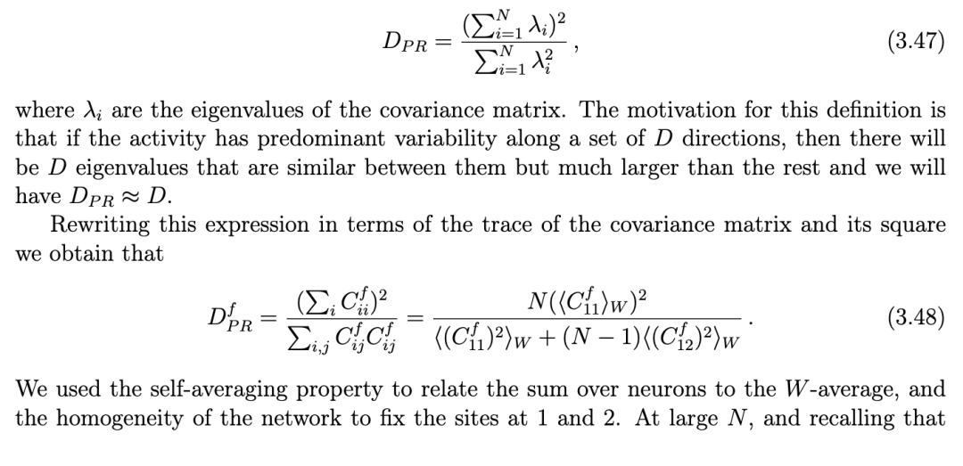 神经系统的计算通常依赖于结构化的神经活动,其维度低于系统状态空间的维度(对我们系统而言即为 N)[12, 28]。 量化维度最常用的方法之一是参与维度(participation dimension)。它由神经元协方差矩阵的本征谱导出。该矩阵是主成分分析(Principal Component Analysis, PCA)[29] 的基础,并反映了神经元对在时间及任务参数变化下的协变关系 [12]。其定义为: