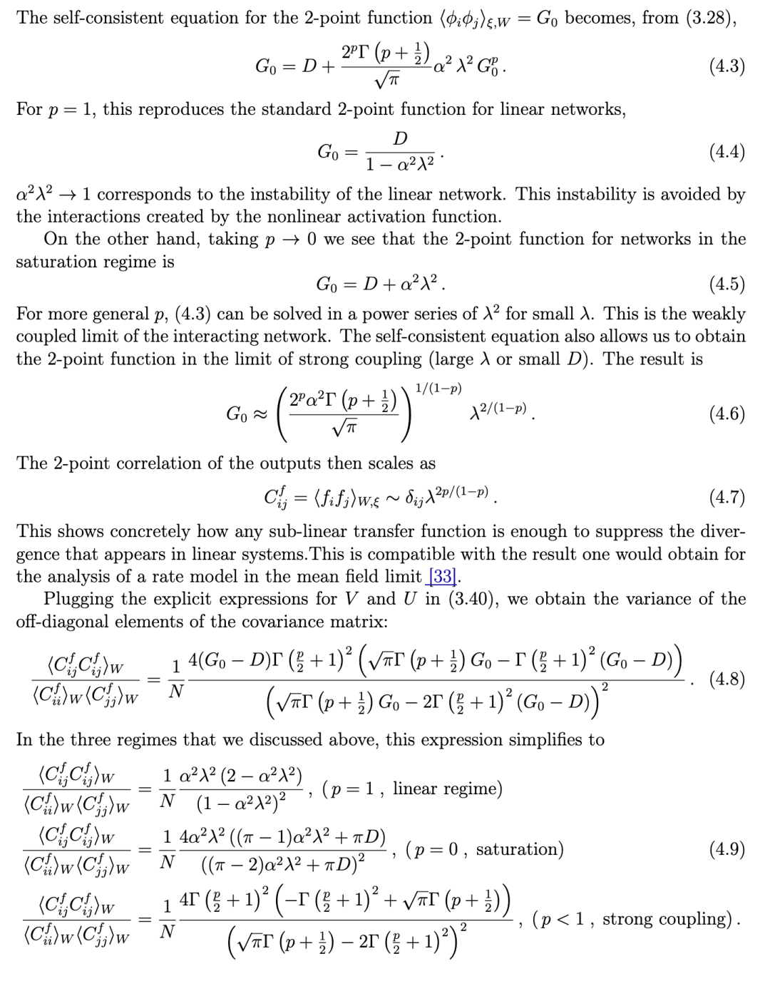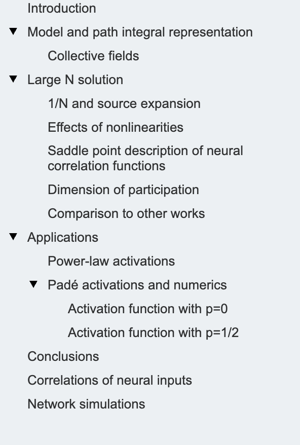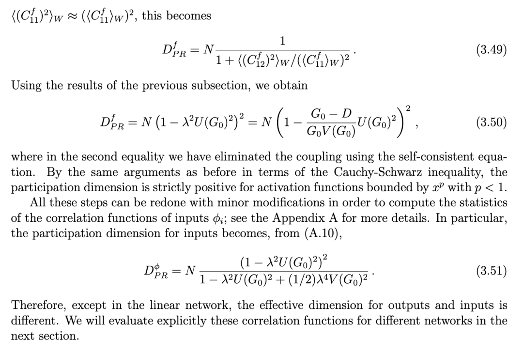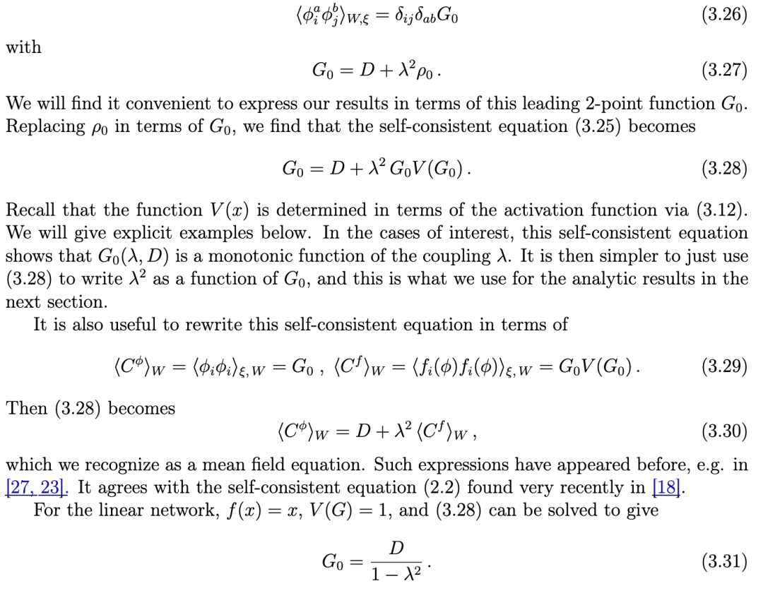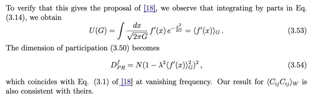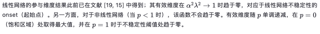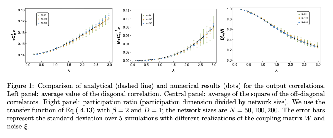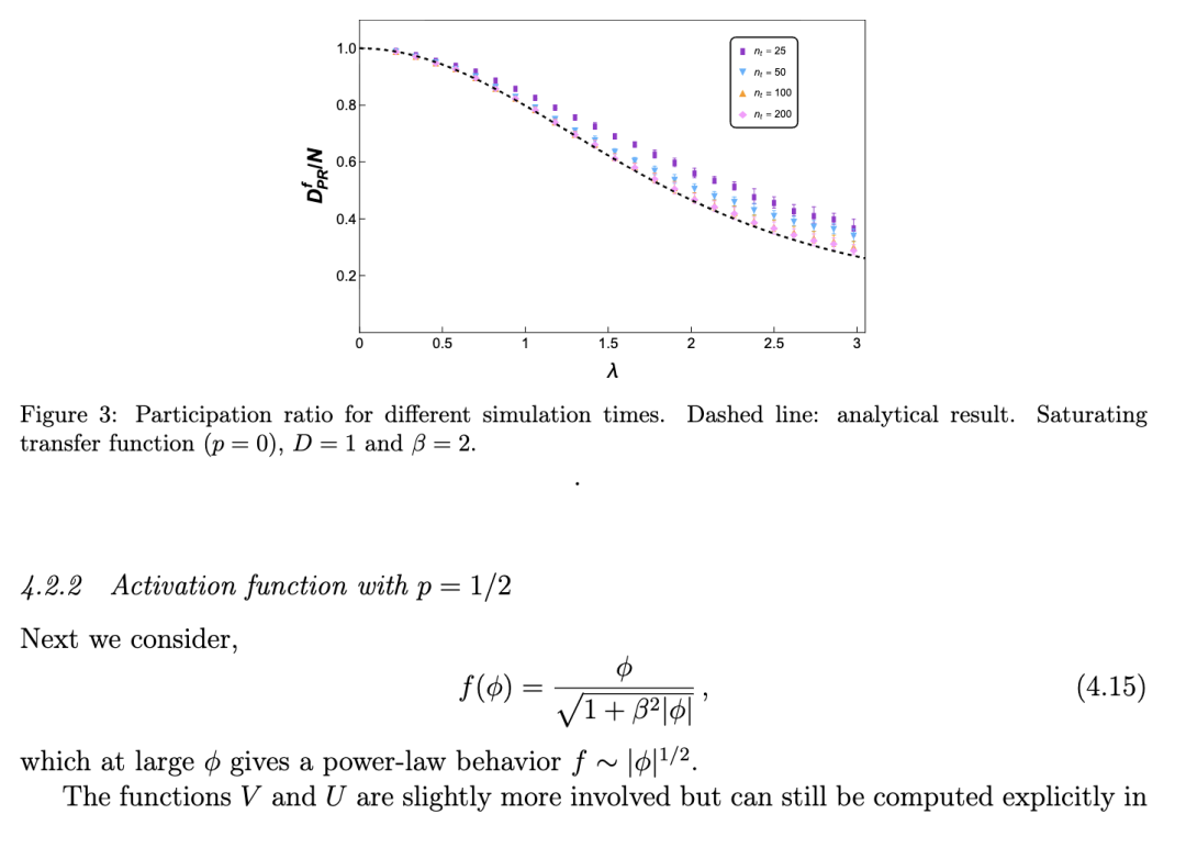 文献 [14] 针对随机连接矩阵和线性动力学情形,计算了协方差矩阵的相关矩。该工作利用路径积分表述,计算至 1/N阶,从而得到参与维度。类似结果也通过随机矩阵方法在 [15] 中导出。但这些结果的一个局限在于:在线性区域,当权重方差过大时,动力学会变得不稳定。而在更现实的系统中,若引入次线性的输入–输出传递函数,这种不稳定性可被抑制。