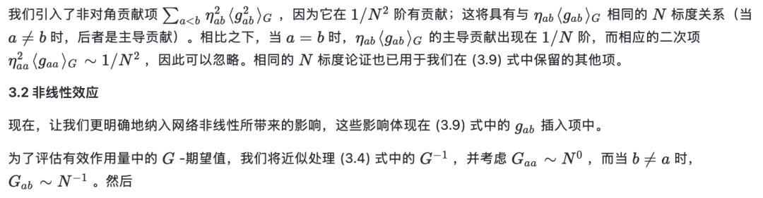 最近的预印本 [18] 提出了一种基于有效耦合的方案来求解非线性网络。该方案源于平均场理论的考虑,并通过数值模拟和随机矩阵理论进行了验证。该方案可从我们的大 N 处理方法中显式推导出来。根据 (3.50) 式,有效耦合所扮演的角色由