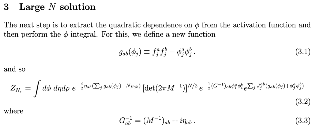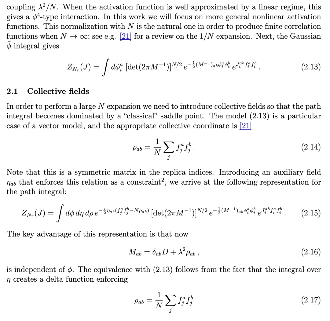 此处出现的积分通常无法获得解析解,原因在于非线性激活函数的存在。然而,我们的主要结论是,当 N ≫ 1 时,一个半经典的鞍点构型将主导配分函数。这将使我们能够在 1/N 展开中解析地计算关联函数,从而为理解非线性 RNN 的动力学提供一个新的非微扰框架。关于使用集体场的路径积分表示的相关工作,请参见 [23, 14]。