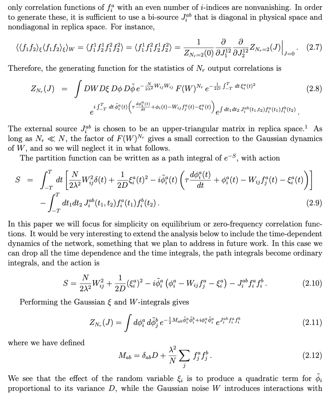 首先考虑一个单一的 ξ-平均。根据奇偶性,包含奇数个插入项的相关函数会消失。包含偶数个 f-插入项的相关函数可以从带有源 Jᵢⱼ(t₁, t₂) 的配分函数中获得,该源对应于 fᵢ(φ(t₁))fⱼ(φ(t₂))。源的时间依赖性允许我们计算不同时间点的相关性;然而,目前我们将为一般情况写出一个配分函数,但本工作的重点将放在时间无关(零频率)的相关性上。引入一个拉格朗日乘子场 φ̃ᵢ,它施加了随机方程 (2.1),则包含 ξ-噪声平均的配分函数的路径积分表示为