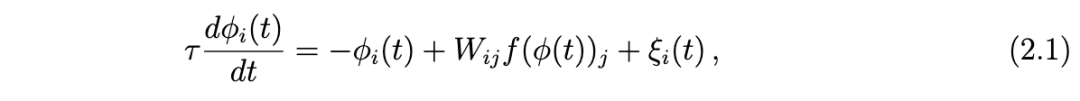 其中,φ 描述输入神经电流,f(φ) 为激活函数,给出神经元输出。我们约定所有重复的下标均需求和。神经元数量 i = 1, ..., N 被视为很大。我们假设非线性函数 f 是规则的,在 φ → -φ 下为奇函数,且在原点处为零,