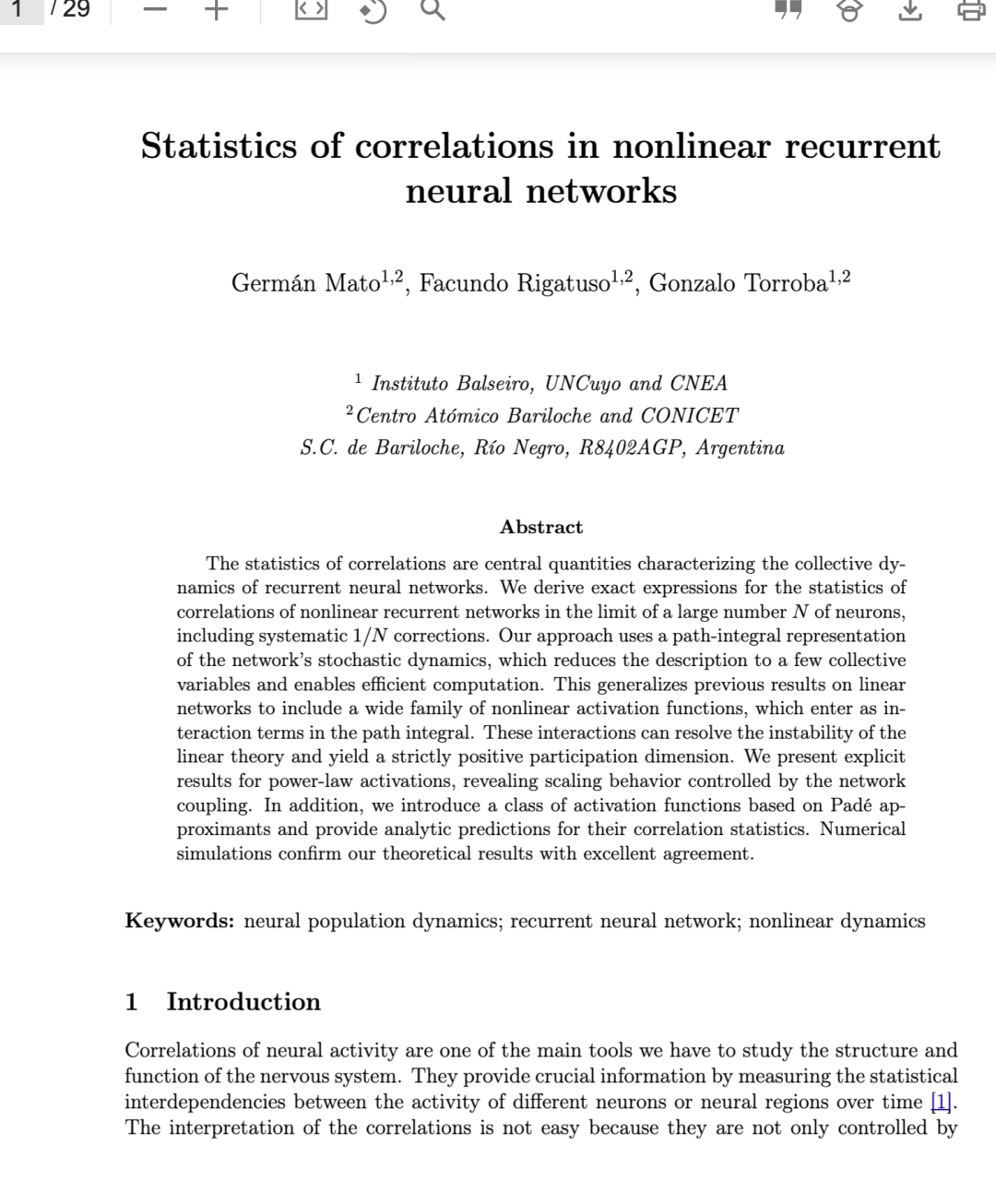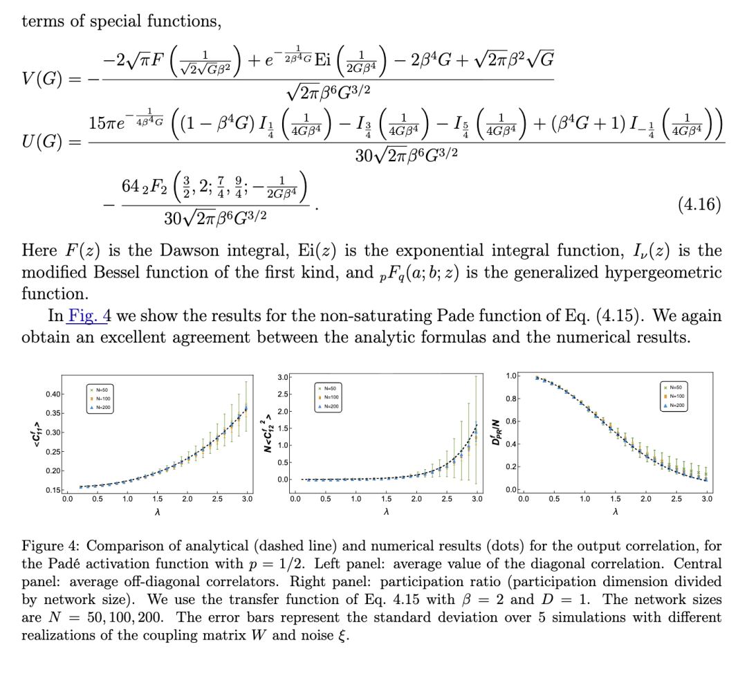 摘要 相关性的统计量是刻画循环神经网络集体动力学的核心量。我们推导出在神经元数量 N很大极限下,非线性循环网络相关性统计的精确表达式,包括系统性的 1/N修正项。我们的方法采用路径积分表述来描述网络的随机动力学,将系统约化为少数几个集体变量,从而实现高效计算。该方法将先前关于线性网络的结果推广到一大类非线性激活函数,这些激活函数在路径积分中表现为相互作用项。这些相互作用可以消除线性理论的不稳定性,并产生严格为正的参与维度(participation dimension)。我们对幂律型激活函数给出了显式结果,揭示了由网络耦合强度控制的标度行为。此外,我们引入一类基于帕德近似(Padé approximants)的激活函数,并对其相关性统计给出解析预测。数值模拟与理论结果高度吻合。