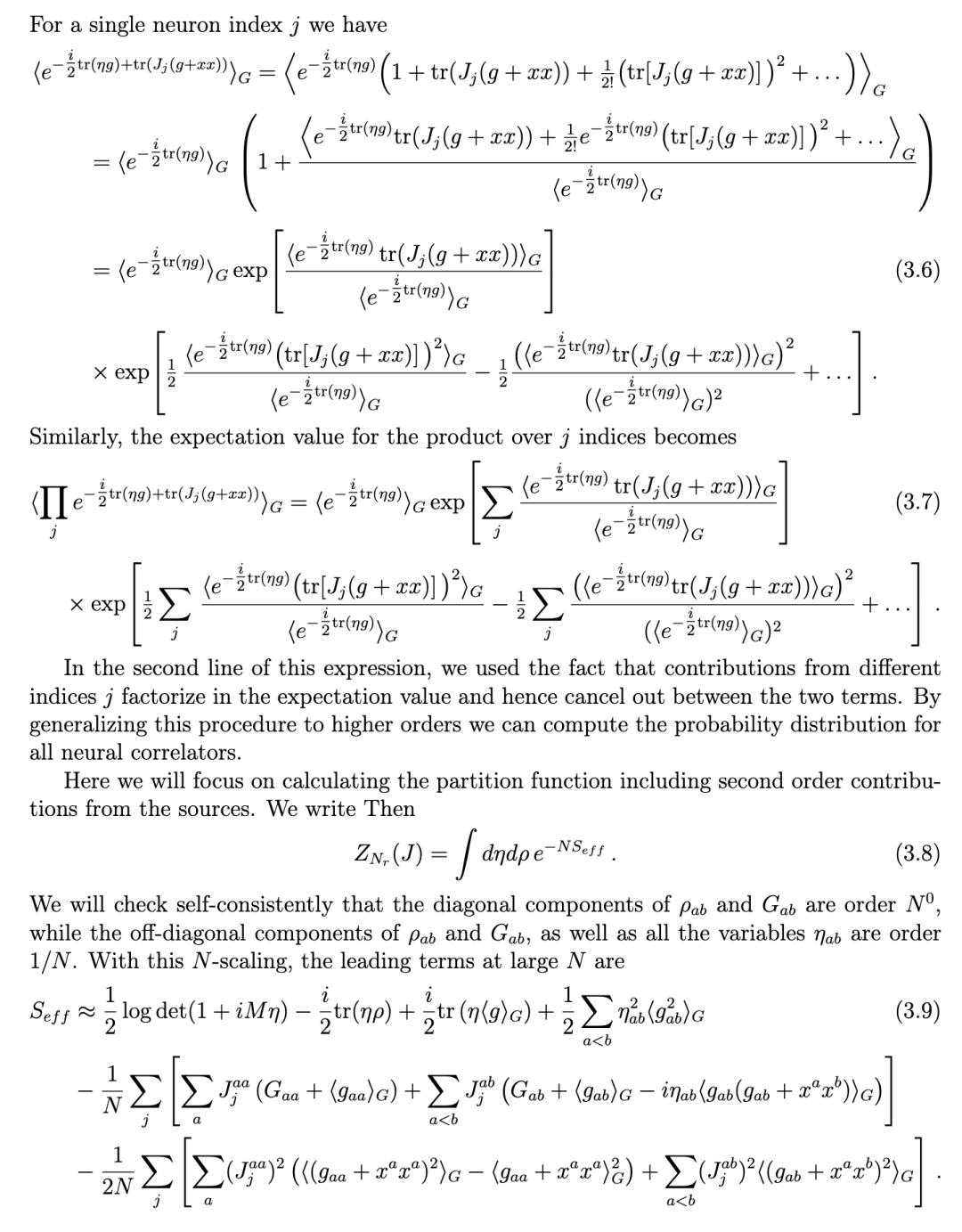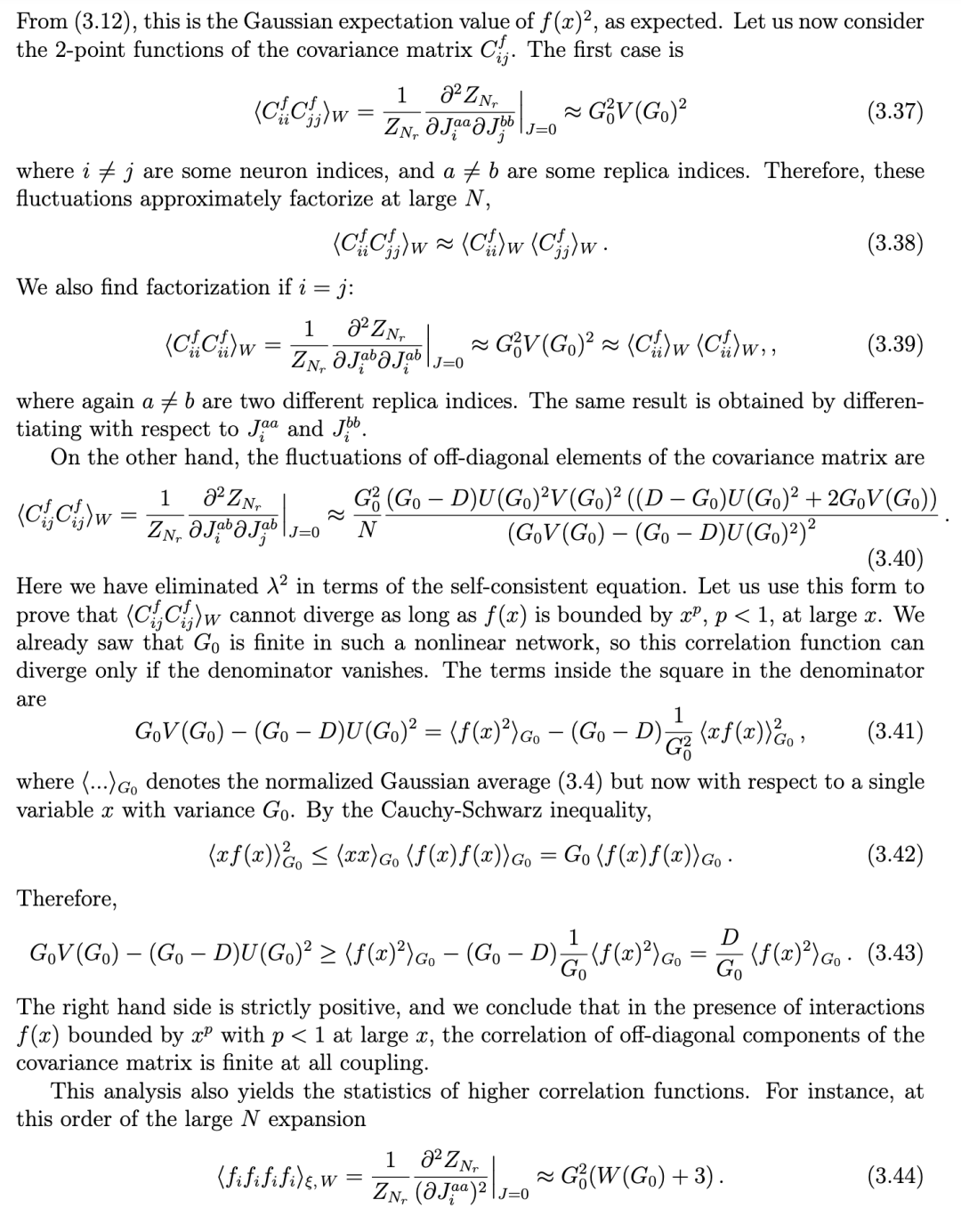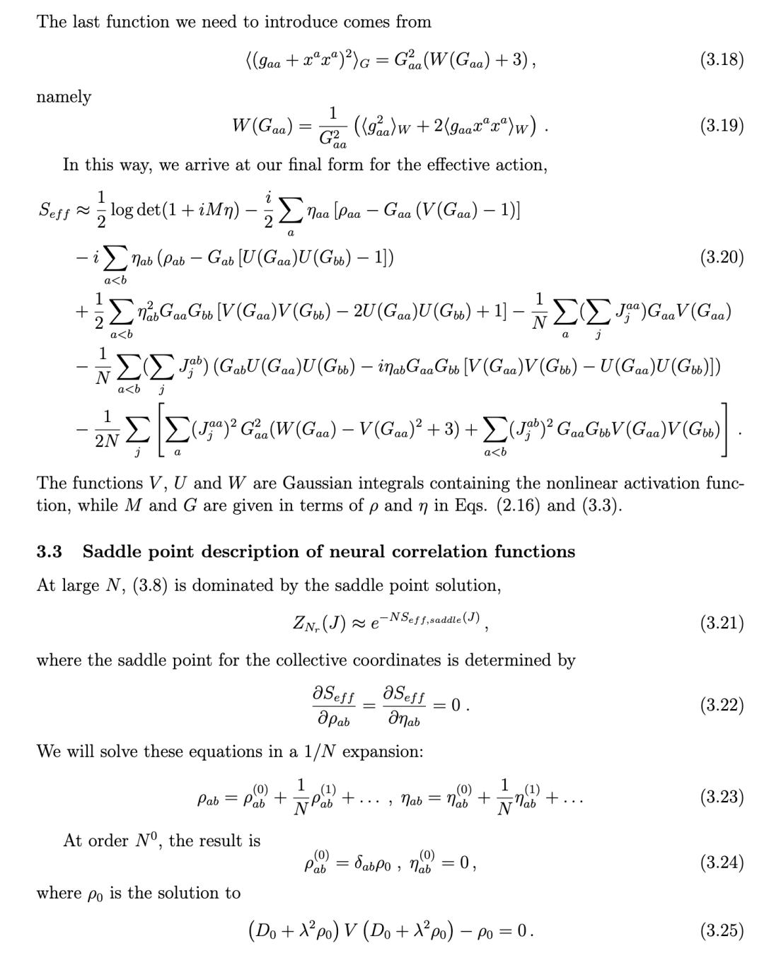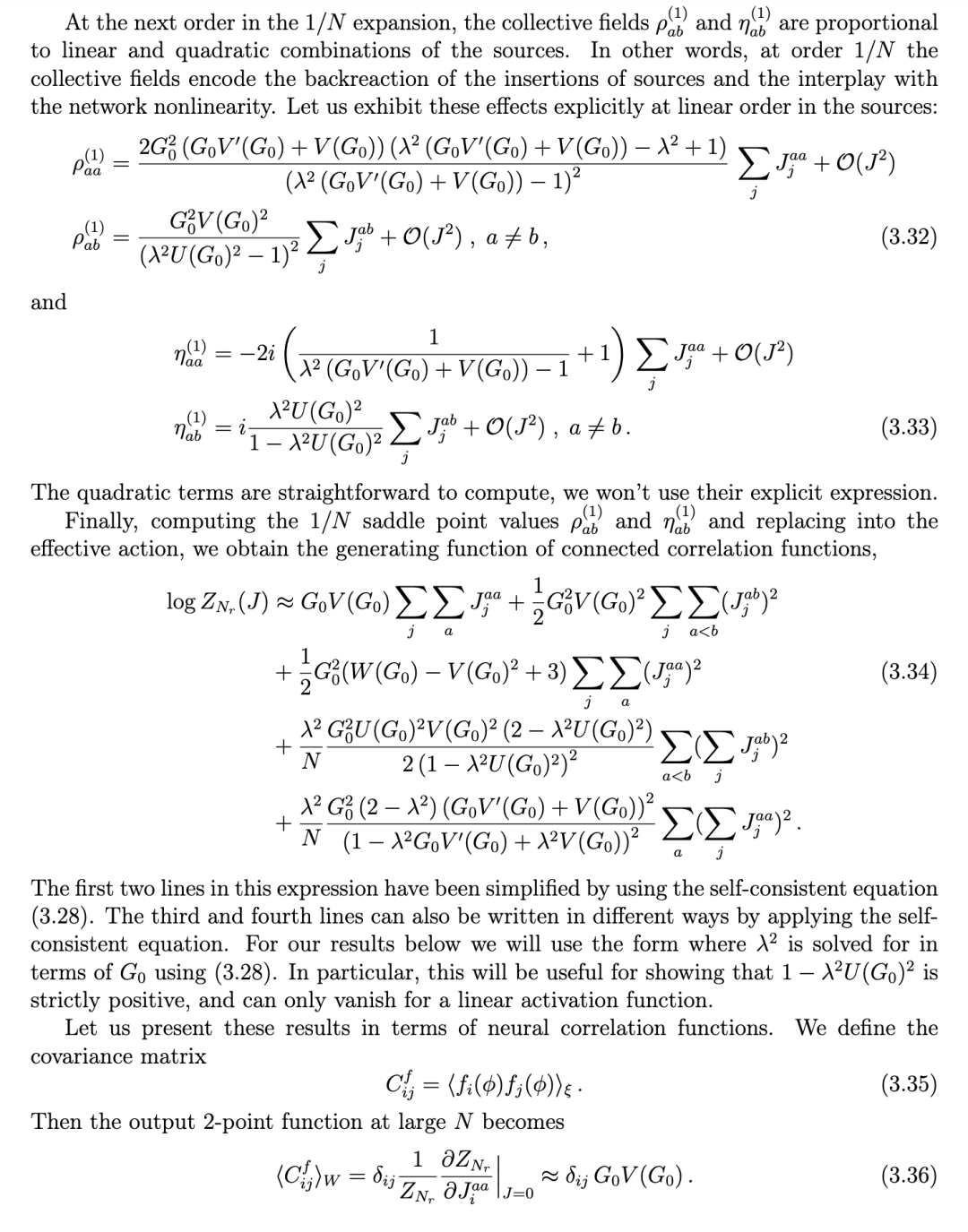 在主导阶上 η = 0 这一事实,为非线性网络的集体场描述提供了一个关键简化:它允许我们对相互作用项 ⟨e^(-i/2)ηg⟩_G 在 (3.5) 式中进行微扰展开,正如我们在 (3.9) 式中所做的那样。在此阶上,所有来自非线性的效应随后都被编码在集体场 ρ 的自洽方程 (3.25) 中。根据 (3.2) 和 (3.3) 式,输入变量在 N⁰ 阶的两点函数变为