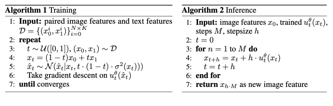 具体而言,我们可以将所有编码后的图像特征视为源分布。对于目标分布,最直接的方法是将所有包含类别名称的提示(prompts)编码为对应的目标特征。在每个速度场训练步骤中,会独立采样一个图像特征和一个文本特征,组成一个训练对。该速度场的目标是将任意给定的图像特征(来自源分布)变换为对应的文本特征(来自目标分布),即实现分类。